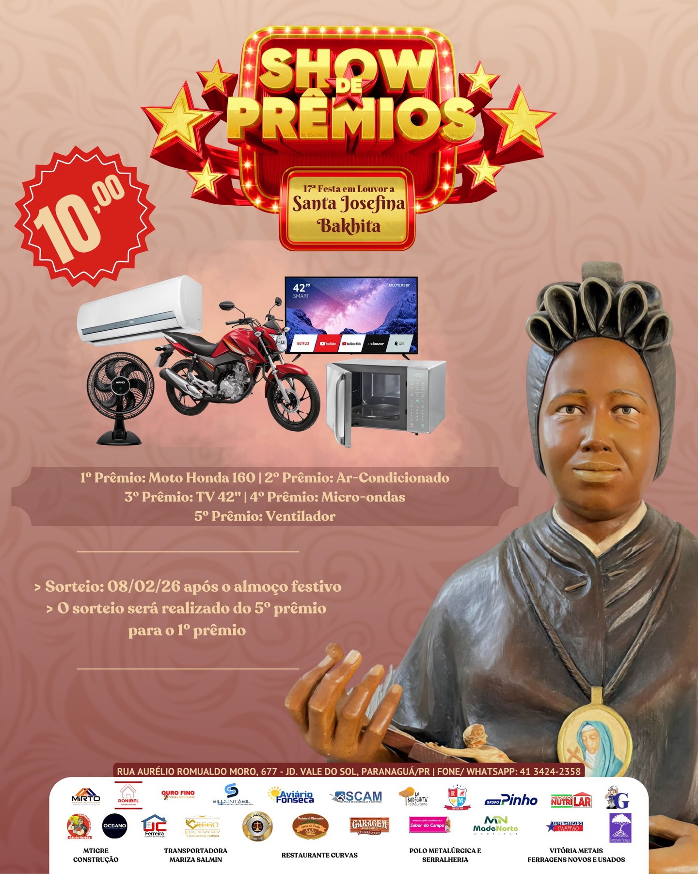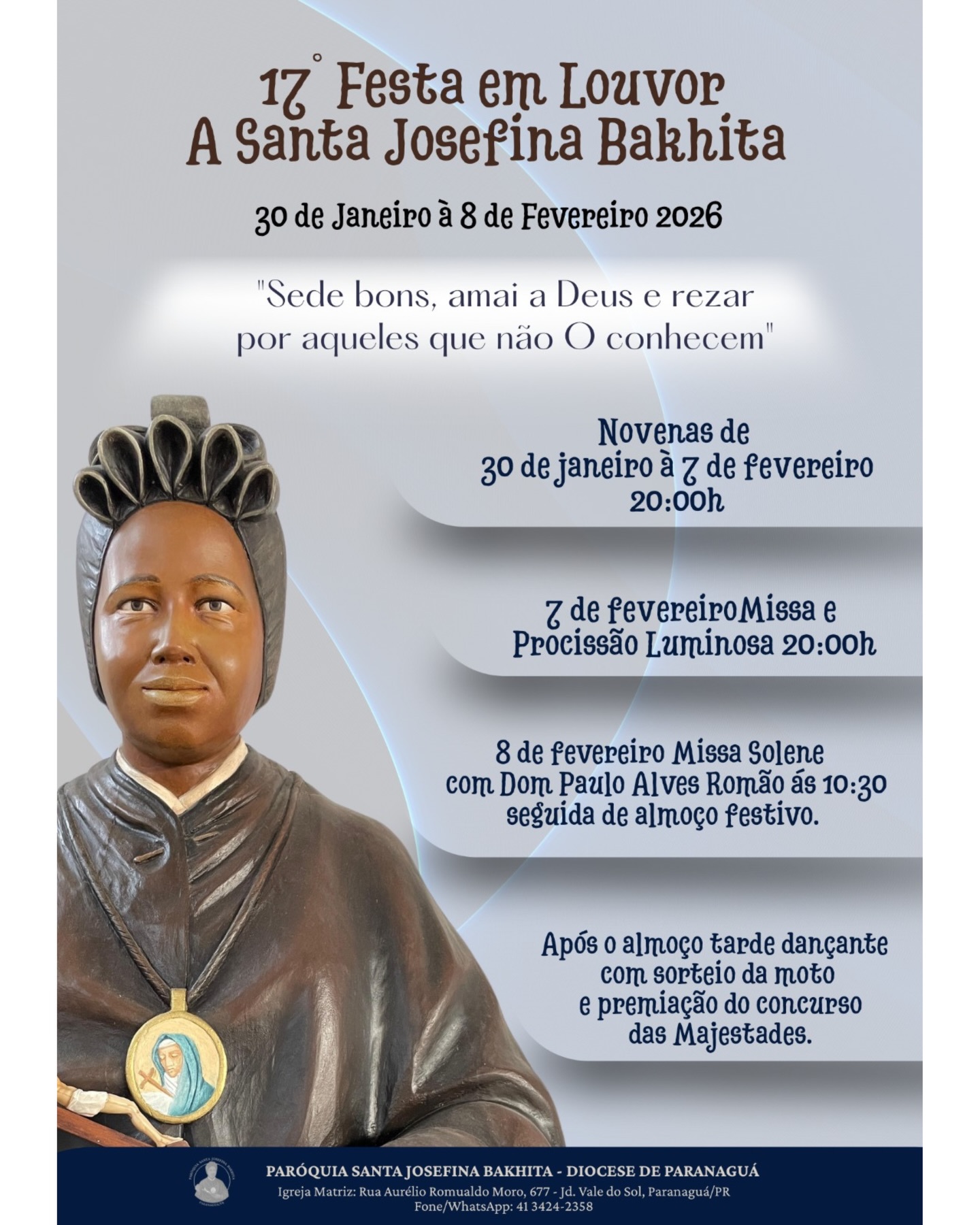 A Paróquia Santa Josefina Bakhita fica na Rua Aurélio Romualdo Moro, 677 – Jd. Vale do Sol – Paranaguá. Mais informações e compra de números para o Show de Prêmios podem ser obtidas por meio do telefone WhatsApp (41) 3424-2358.