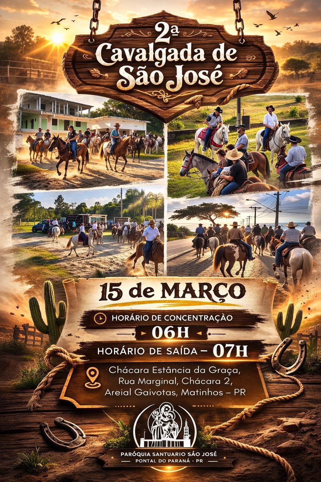 A programação segue no dia 15 de março com a 2ª Cavalgada de São José. A Missa será celebrada às 10h, no Santuário, seguida de almoço com churrasco Costela Fogo de Chão e binguinho.