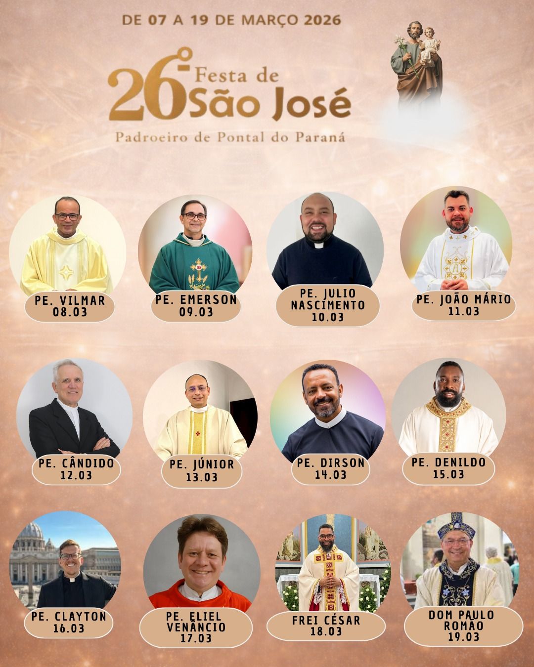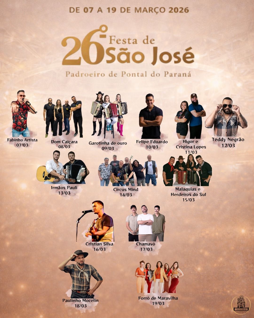 A tradicional Festa de São José, da Paróquia Santuário São José, será realizada de 7 a 19 de março, em Pontal do Sul, em Pontal do Paraná. Em sua 26ª edição, em 2026, a programação religiosa e festiva, que celebra o padroeiro do município, inclui missas, novenas, apresentações culturais, atividades sociais, eventos esportivos, cavalgada, almoço festivo, procissão motorizada e shows gratuitos, reunindo a comunidade ao longo de quase duas semanas de celebração.