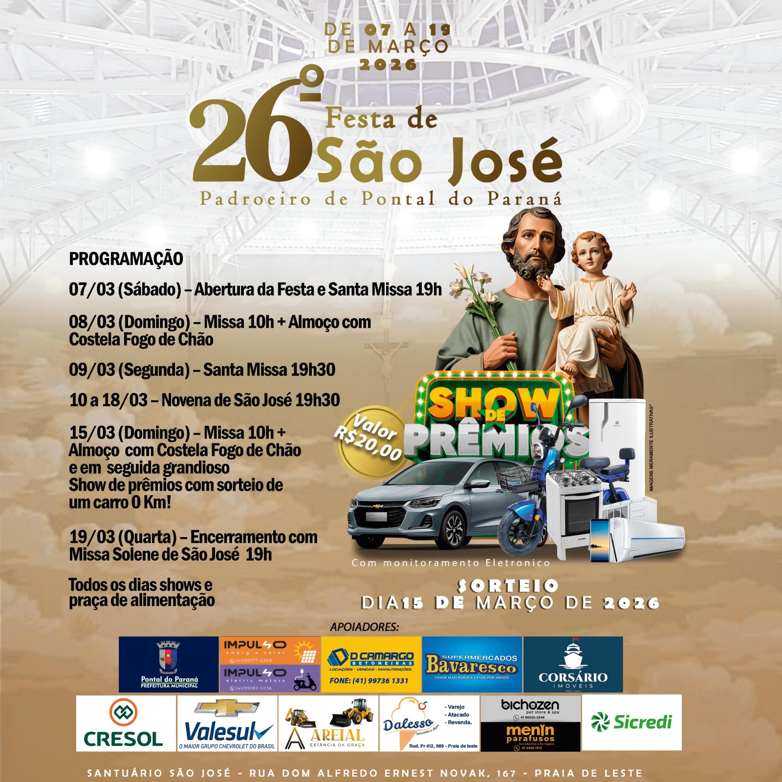 Às 17h terá início o Show de Prêmios, com cartelas no valor de R$ 20,00. Entre os prêmios estão: 01 Onix 0km, 01 Mini Scooter, 01 Smartphone, 01 Ar Condicionado, 01 Geladeira e 01 Fogão.