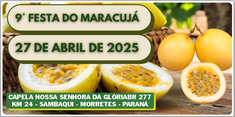 A tradicional Festa do Maracujá está de volta e promete movimentar o bairro Sambaqui, em Morretes, no próximo dia 27 de abril, com uma programação especial que une fé, cultura, gastronomia e música. O evento será realizado na Capela Nossa Senhora da Glória (BR-277, Km 24, sentido Paranaguá), das 10h30 às 22h, e deve atrair cerca de 10 mil visitantes ao longo do dia.