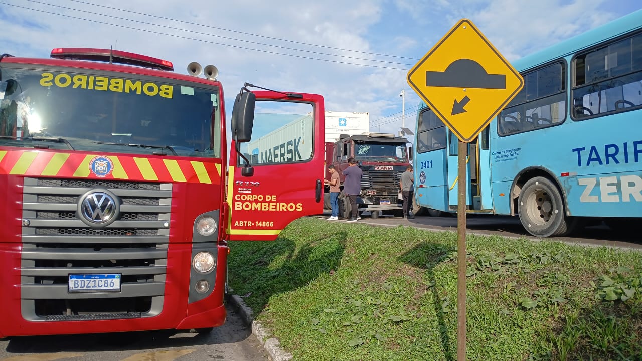 Um acidente envolvendo um caminhão carregado com container refrigerado e um ônibus do transporte coletivo urbano de Paranaguá mobilizou equipes de resgate na manhã desta quarta-feira (18), na marginal da Avenida Ayrton Senna da Silva, sentido porto. A colisão ocorreu por volta das 9h, a cerca de 200 metros do viaduto Manfredo Cominese, em frente à Igreja Assembleia de Deus, no bairro Eldorado.