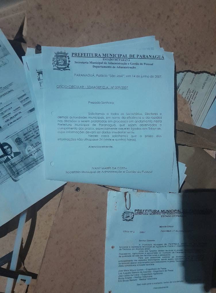 Em um vídeo gravado no local da ocorrência, divulgado no sábado, o prefeito mostrou pilhas de documentos descartados em um terreno na Ilha dos Valadares. Segundo ele, os materiais incluem pastas com registros de pescadores vinculados à Prefeitura. “Isso aqui é lixo, vocês estão vendo. Aqui atrás fica o material de construções Andrioli, na Ilha dos Valadares. Ontem, recebemos uma denúncia, com um vídeo mostrando que documentos de pescadores foram descartados, ainda organizados em pastas como essa”, afirmou.