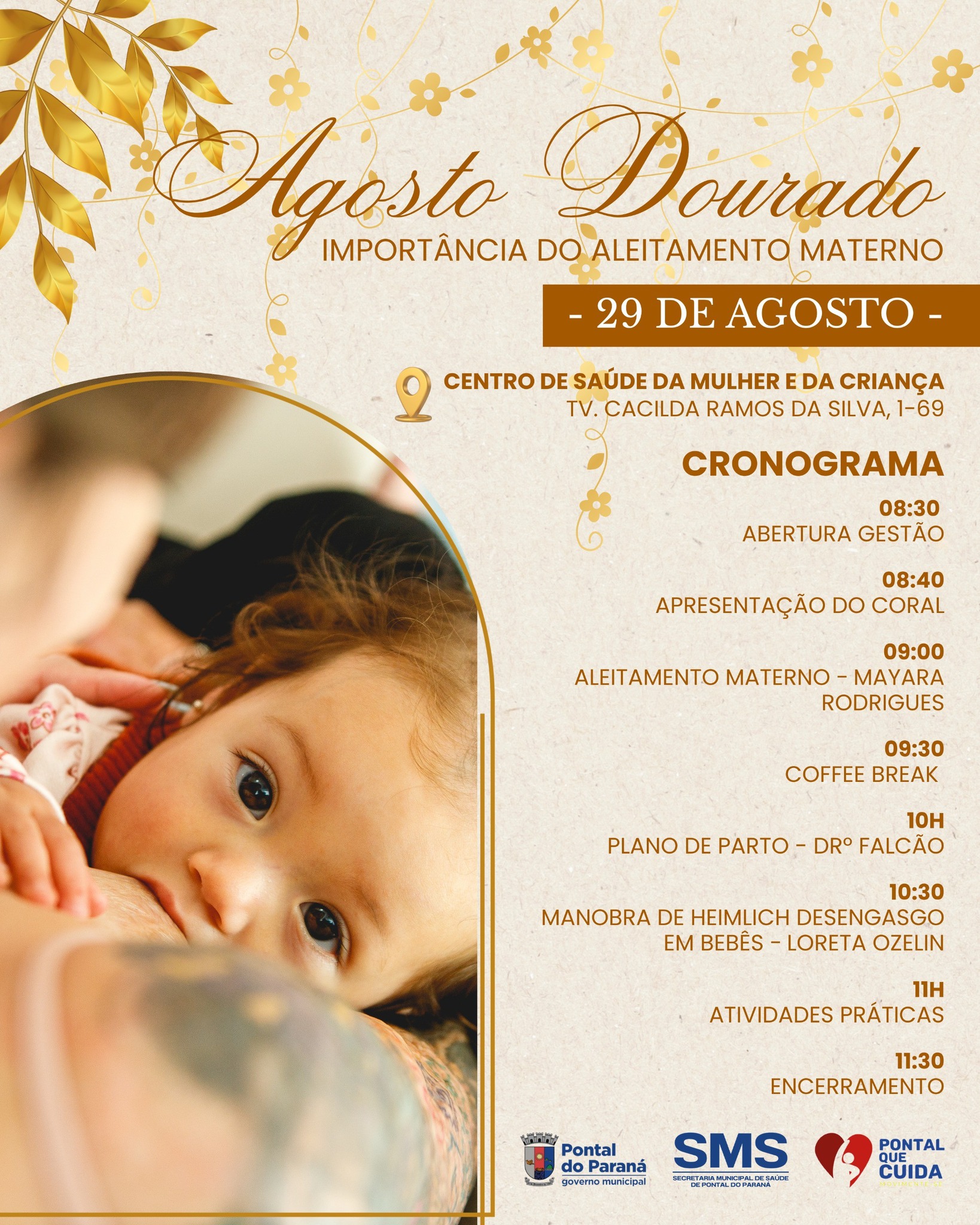 O mês de agosto, conhecido como Agosto Dourado, é marcado por ações de conscientização sobre a importância do aleitamento materno. Em Pontal do Paraná, no dia 29 de agosto, o Centro de Saúde da Mulher e da Criança sediará uma programação especial dedicada a mães, gestantes, famílias e profissionais da saúde, com palestras, apresentações e atividades práticas.