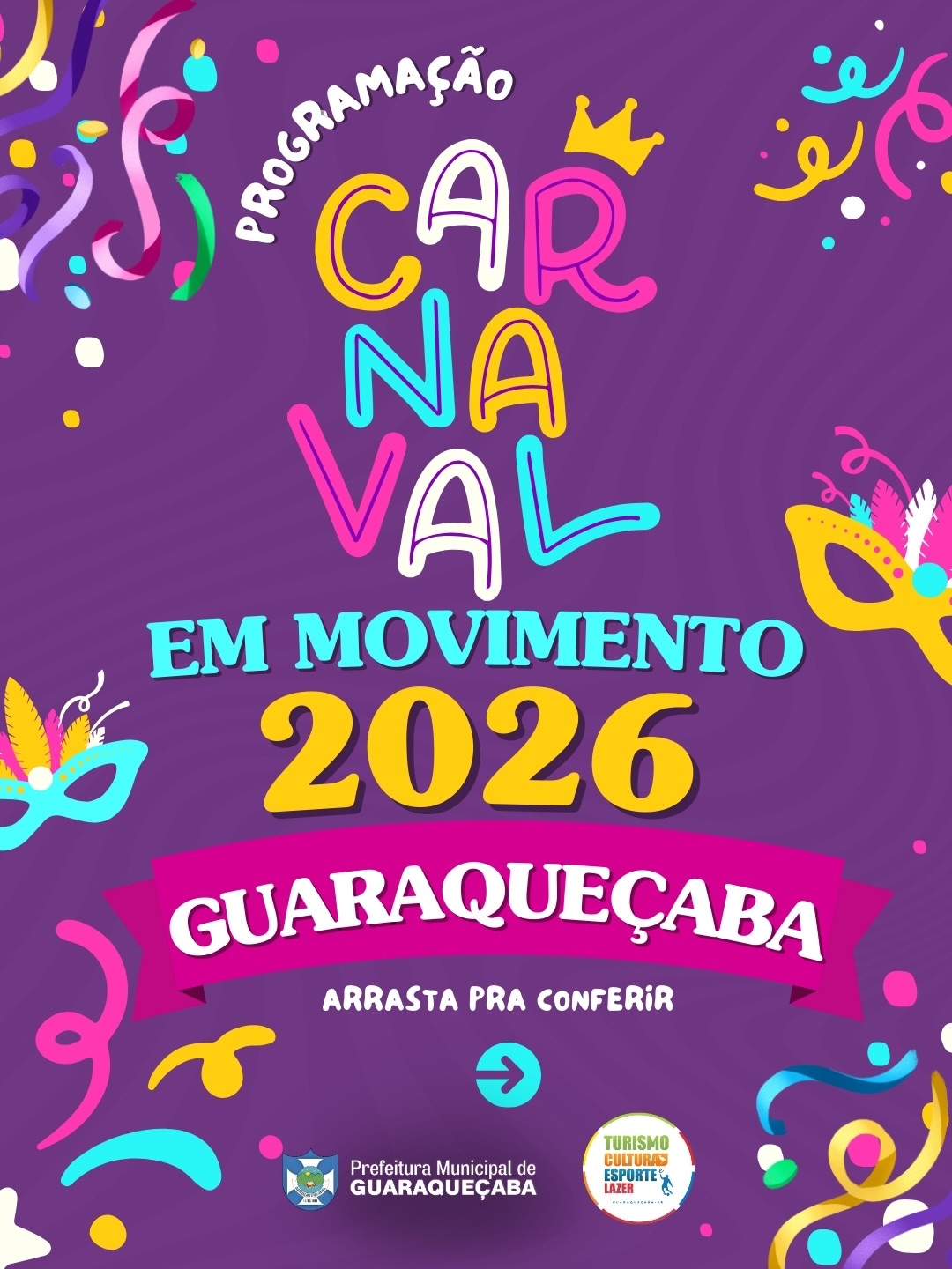 Na quinta-feira, 5, a Prefeitura de Guaraqueçaba, por meio da Secretaria Municipal de Turismo, Cultura, Esporte e Lazer, divulgou a programação do Carnaval 2026. A folia será nos dias 14 e 15 de fevereiro (sábado e domingo). O “Carnaval em Movimento” 2026 de Guaraqueçaba terá uma programação voltada ao público familiar, reunindo atividades esportivas, culturais e musicais. A proposta é oferecer opções de lazer e descanso para moradores e visitantes que buscam aproveitar o período carnavalesco com tranquilidade, integração e contato com a natureza.