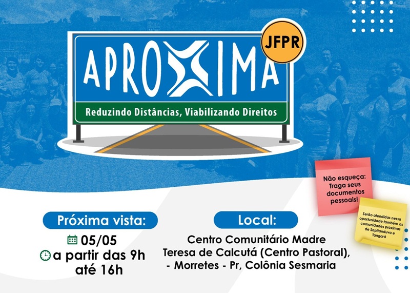Promovido pela Justiça Federal do Paraná, o Projeto Aproxima tem como missão garantir cidadania e fortalecer os direitos de populações em situação de vulnerabilidade por meio de atendimentos descentralizados e gratuitos. Em Morretes, a iniciativa conta com o apoio da Secretaria Municipal de Assistência Social e mobiliza uma ampla rede institucional.