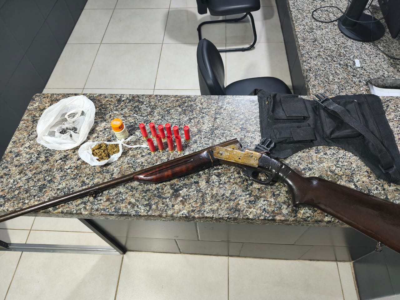 O homem, de 41 anos, carregava uma carabina calibre .32, e uma pochete com 6 munições intactas, 4 deflagradas, um pote pequeno com pólvora e chumbo.