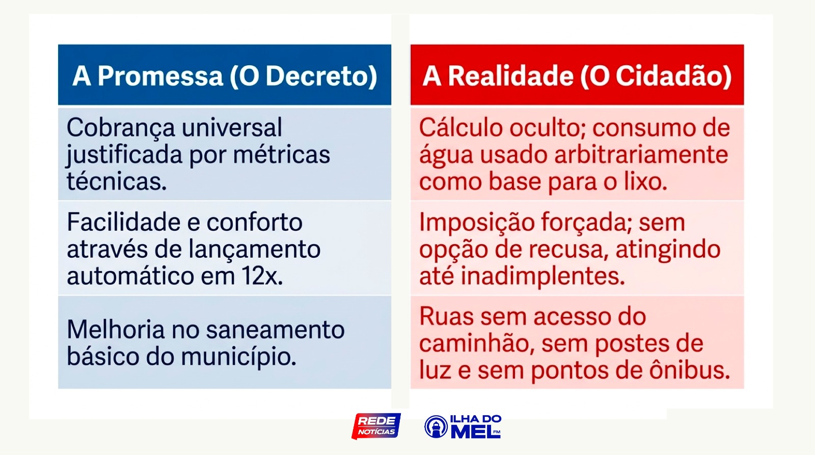 Os relatos reforçam a percepção de parte da população de que há cobrança por serviços que não são prestados de forma integral, além da ausência de informações claras sobre os critérios adotados pelo Município.