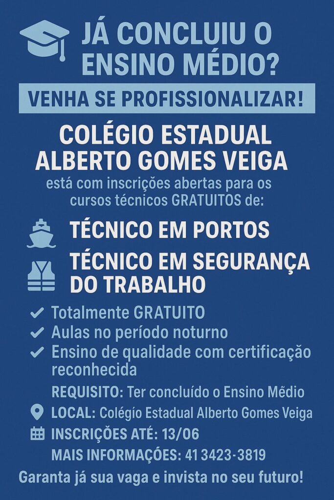 O Colégio Estadual Alberto Gomes Veiga está com inscrições abertas para os cursos técnicos subsequentes em Técnico em Portos e Técnico em Segurança do Trabalho. As matrículas podem ser feitas até esta sexta-feira, dia 13, na secretaria da escola.