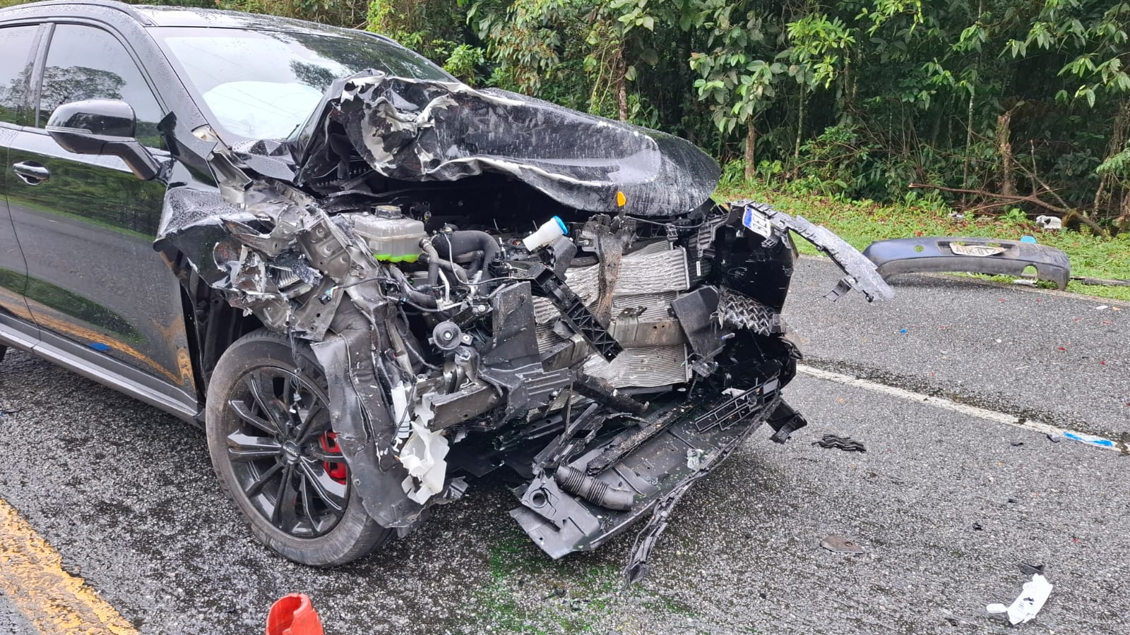 O motor, várias peças e acessórios do Ford Fiesta ficaram espalhados pela pista. O carro, completamente destruído, bateu em uma árvore.