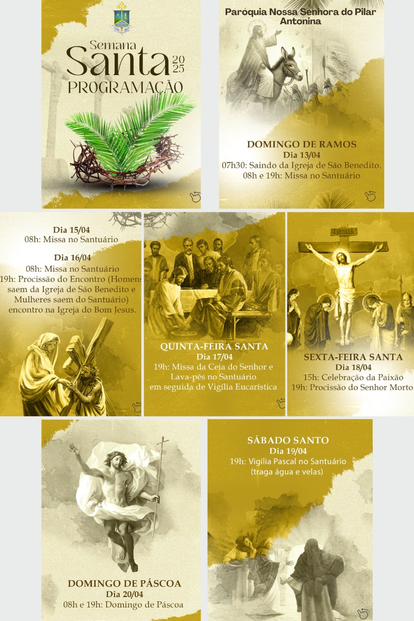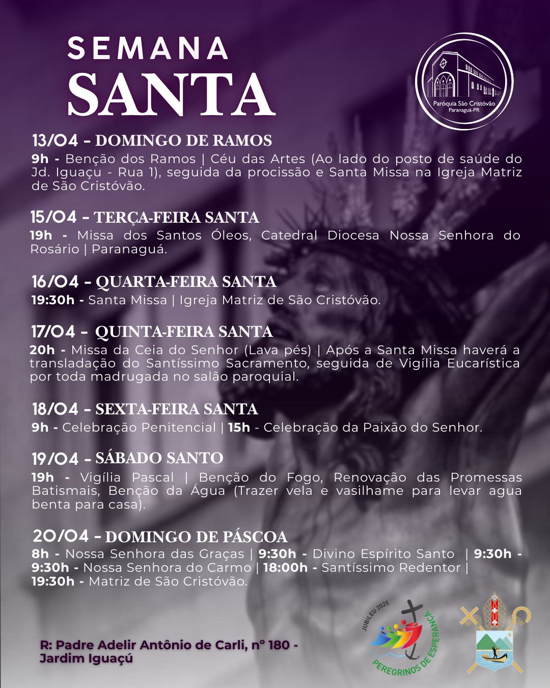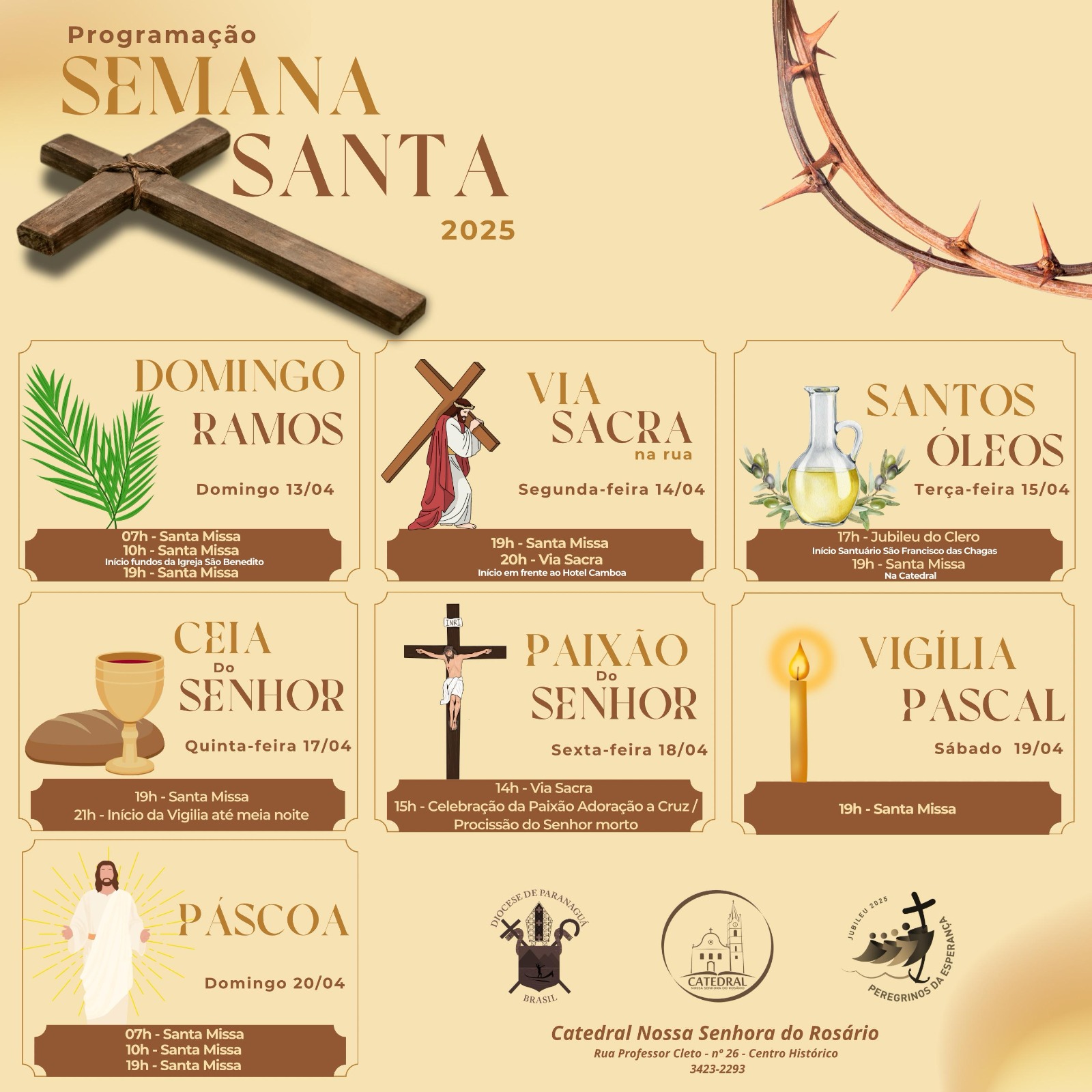 • Já no Sábado Santo (19 de abril), a Vigília Pascal começa às 19h30, com a bênção do fogo novo, da água batismal e a Missa da Ressurreição, marcando a alegria da Páscoa.