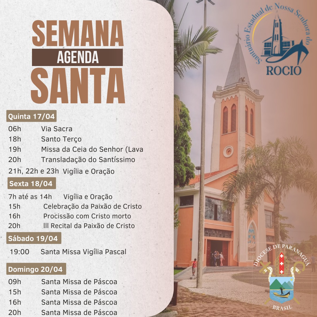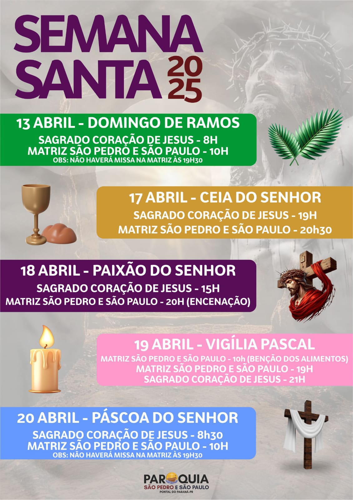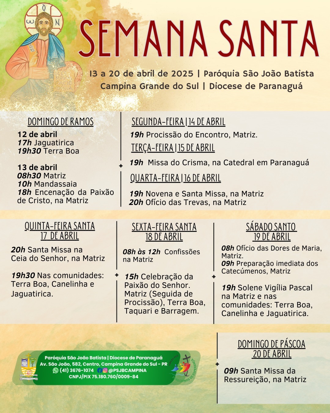 • Já no Sábado Santo (19 de abril), a Vigília Pascal começa às 19h30, com a bênção do fogo novo, da água batismal e a Missa da Ressurreição, marcando a alegria da Páscoa.