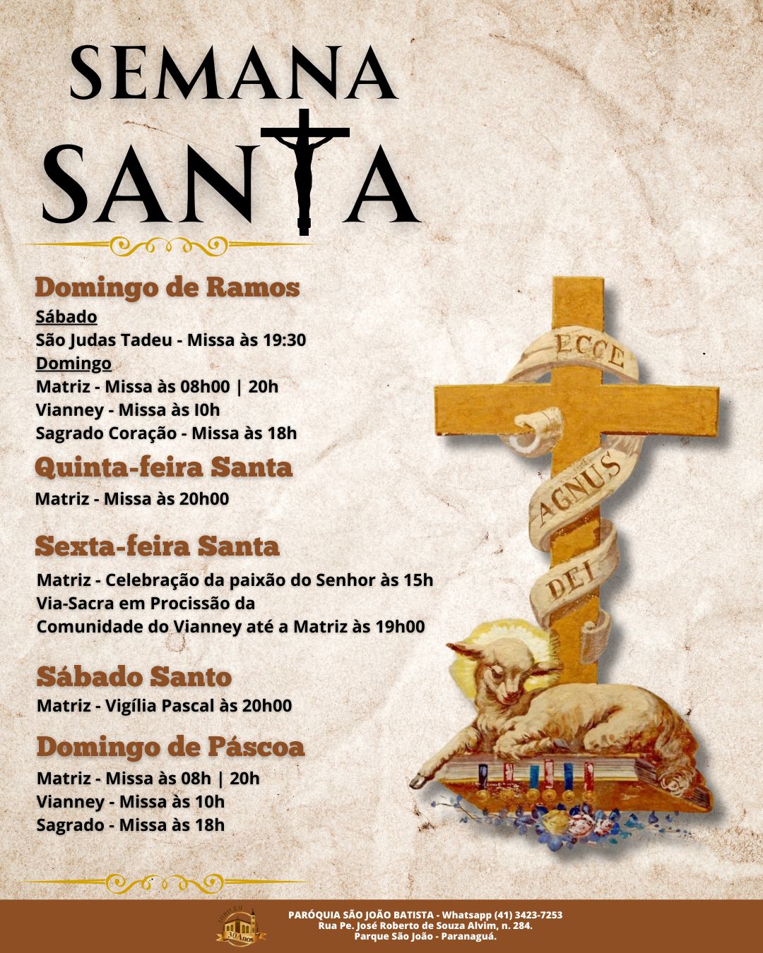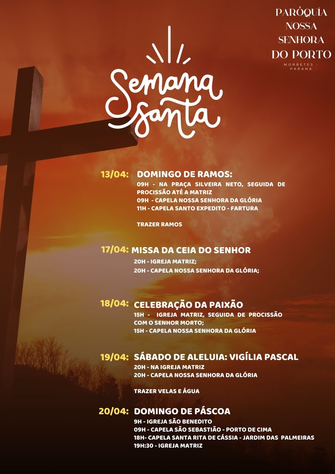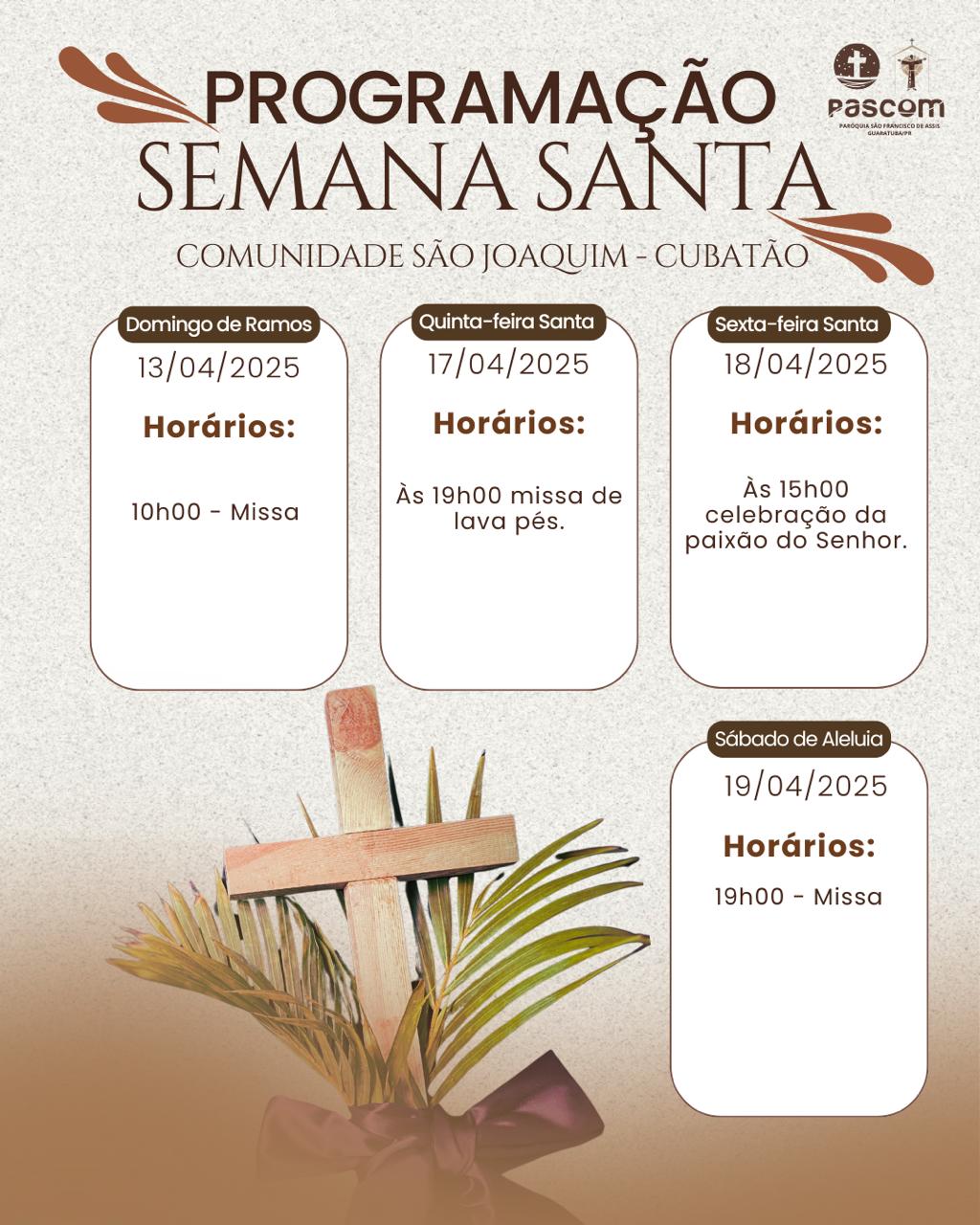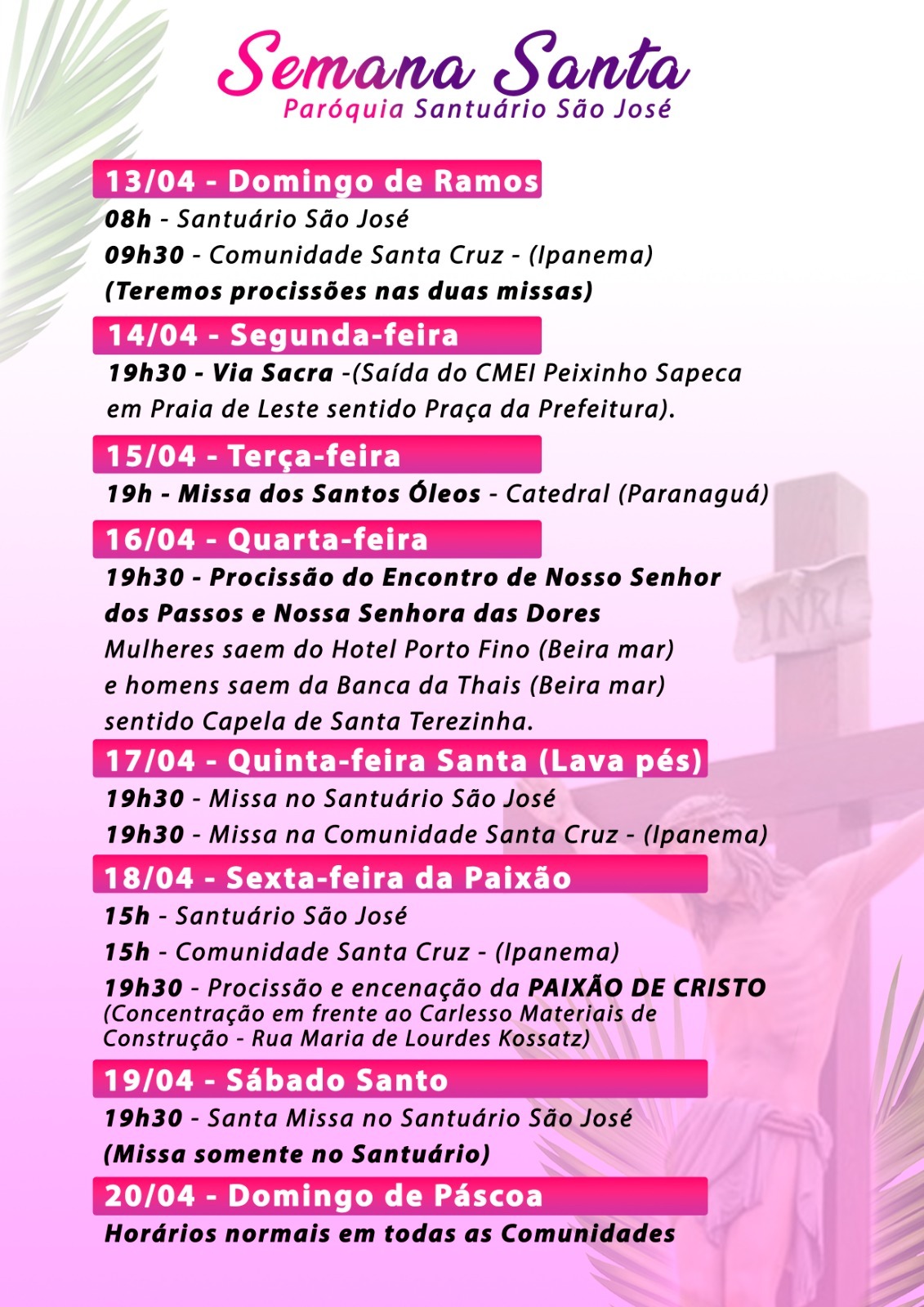• Na Sexta-feira da Paixão (18 de abril), feriado nacional, a celebração da Paixão do Senhor terá início às 15h, recordando a flagelação, crucificação e morte de Jesus.