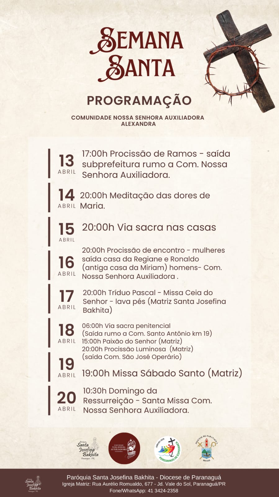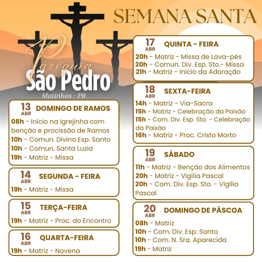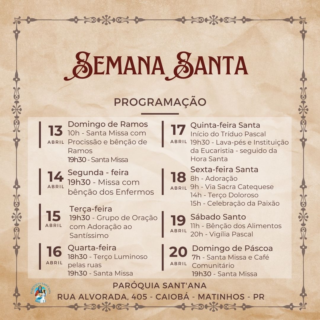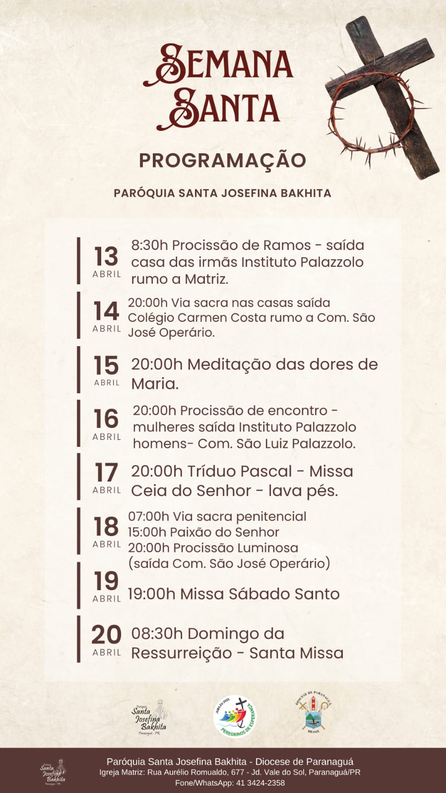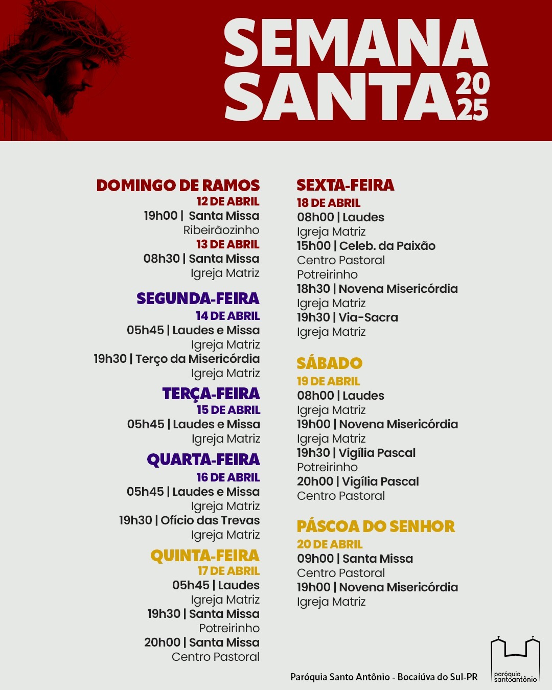 • Na Sexta-feira da Paixão (18 de abril), feriado nacional, a celebração da Paixão do Senhor terá início às 15h, recordando a flagelação, crucificação e morte de Jesus.