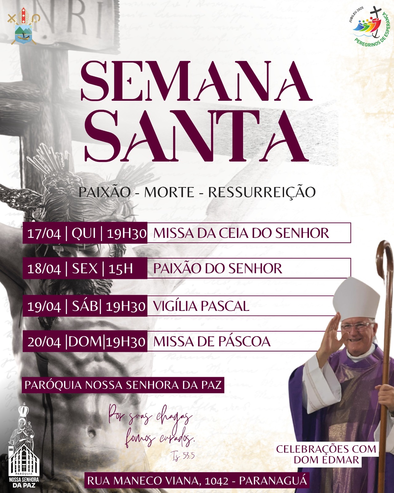 • Na Quinta-feira Santa (17 de abril), Dom Edmar Peron preside às 19h30 a Missa da Ceia do Senhor, com o tradicional rito do lava-pés, simbolizando o serviço e o amor ao próximo.