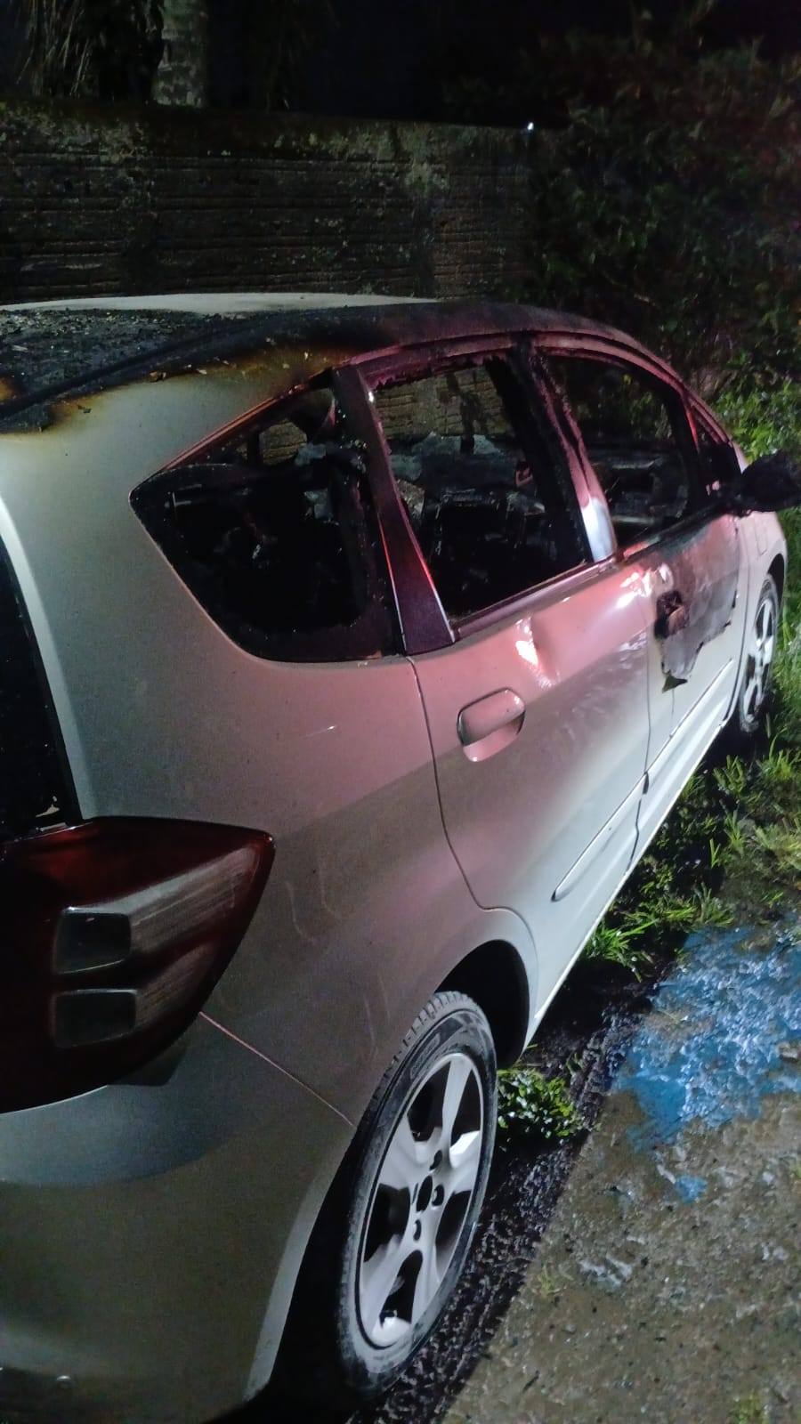 Antes de fugir, os ocupantes colocaram fogo no interior do Honda Fit, cor prata.