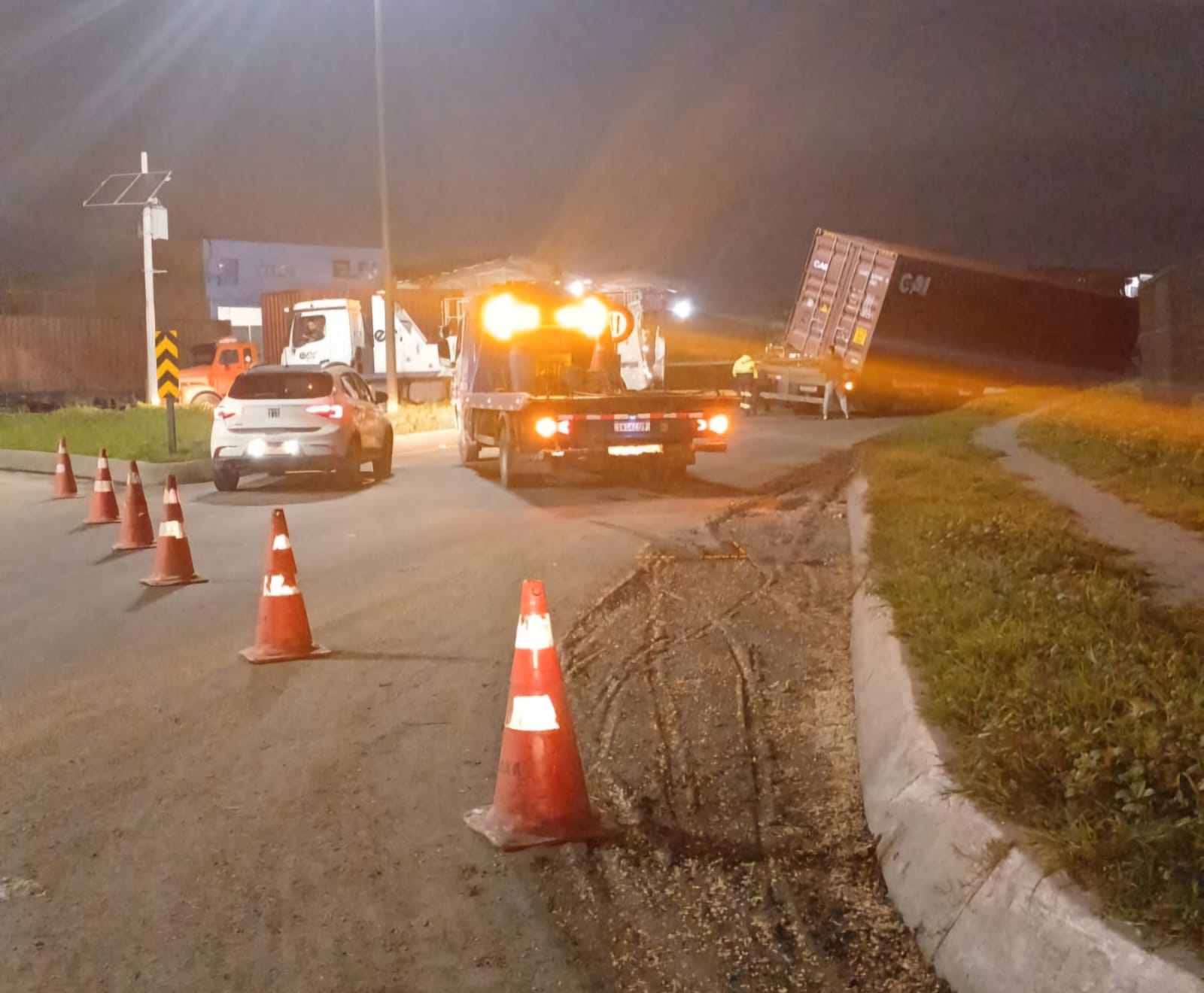 Criminosos tentaram roubar a carga de um caminhão que ficou atolado em um trecho da Rua Tapyr Lopes, na Vila São Jorge, em Paranaguá, na madrugada desta terça-feira, 3.