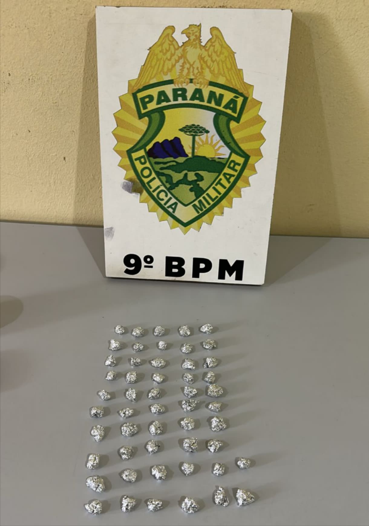 Ao realizar buscas no local, as equipes encontraram entre duas árvores, um pote plástico com 50 pedras de crack embaladas e prontas para serem comercializadas.