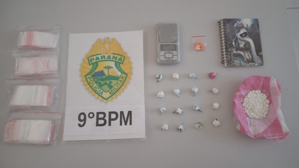 Embaixo de uma pia, dentro de uma bolsa transparente, os militares encontraram porções de cocaína, comprimidos de ecstasy, uma balança de precisão, centenas de embalagens plásticas e uma caderneta com anotações do tráfico.