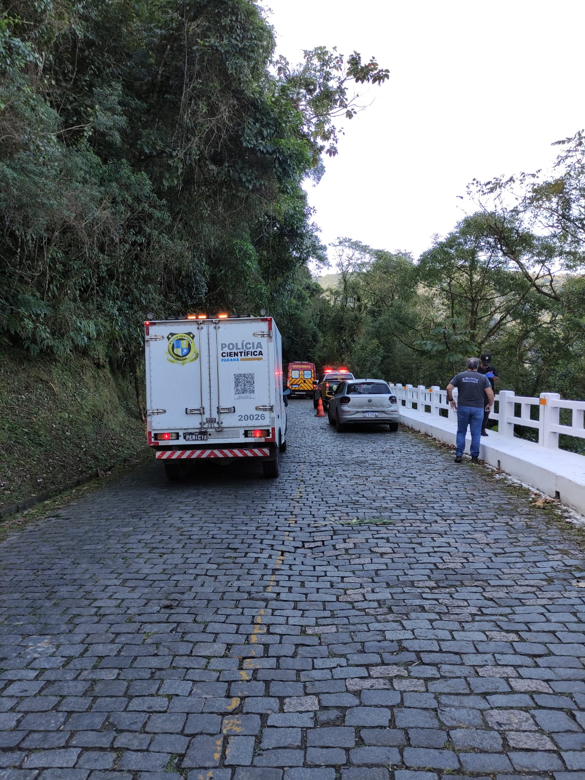 O corpo de um homem, ainda não identificado, foi encontrado caído embaixo de uma ponte, a 7 metros de altura, na Estrada da Graciosa, em Morretes.