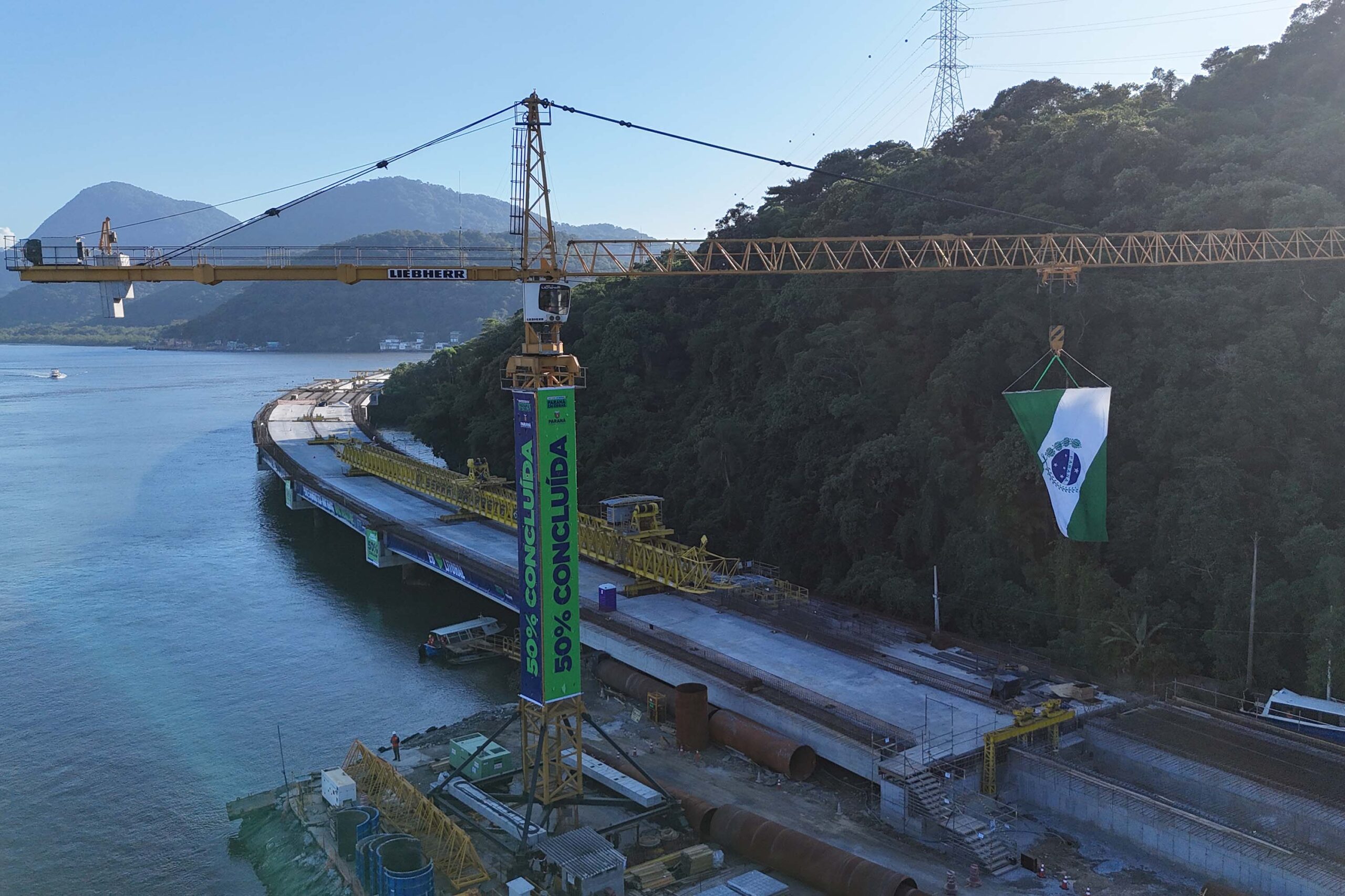 O tabuleiro da ponte também avança rapidamente. Já foram concretadas seis lajes (30% do total previsto para o trecho pré-moldado), que formarão o piso por onde os veículos transitarão.