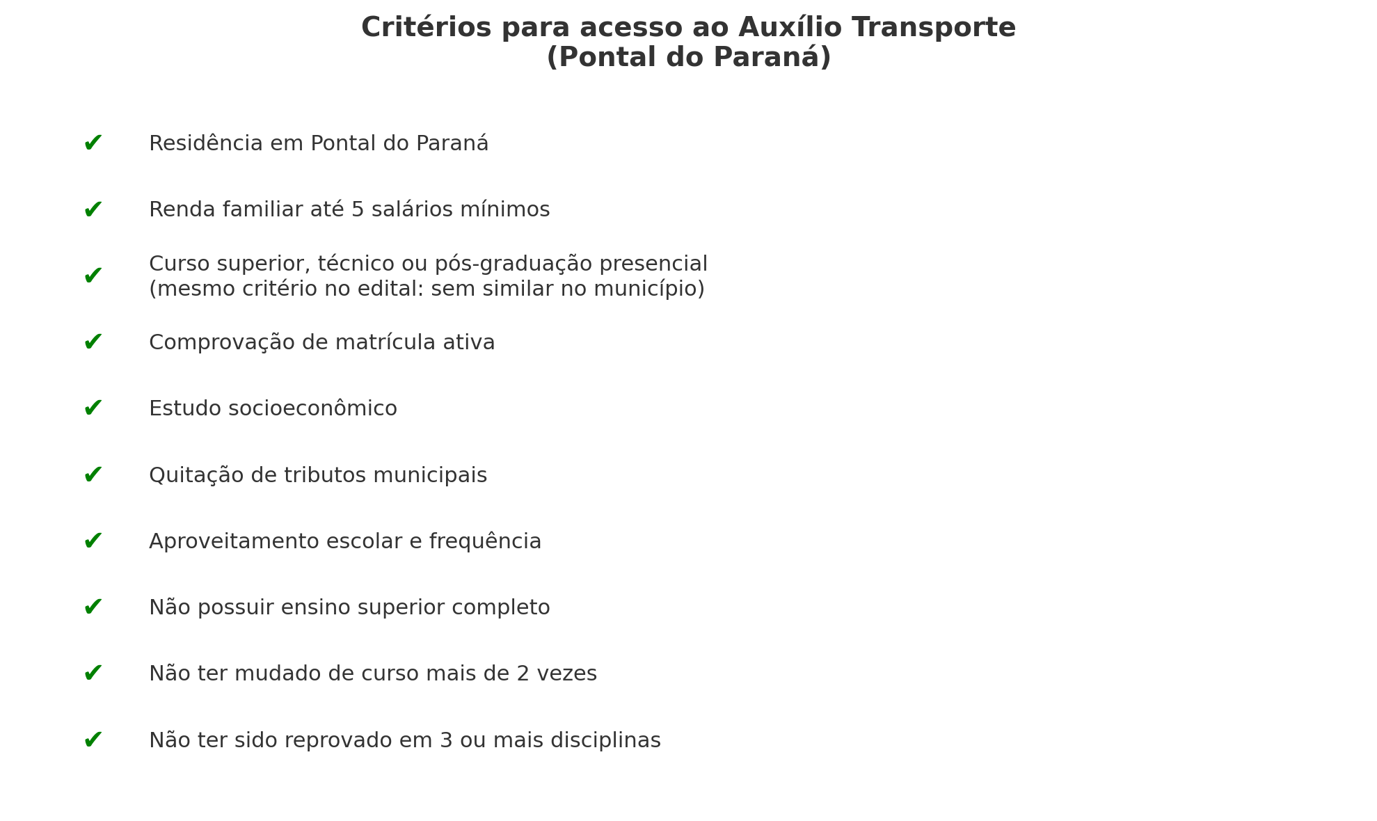 O benefício é concedido exclusivamente a alunos de baixa renda, com renda familiar bruta de até cinco salários mínimos. Além disso, os candidatos devem comprovar residência em Pontal do Paraná, matrícula regular e bom desempenho acadêmico. Há critérios específicos que impedem o acúmulo indevido do auxílio, como reprovação em três ou mais disciplinas, ou mudanças frequentes de curso.