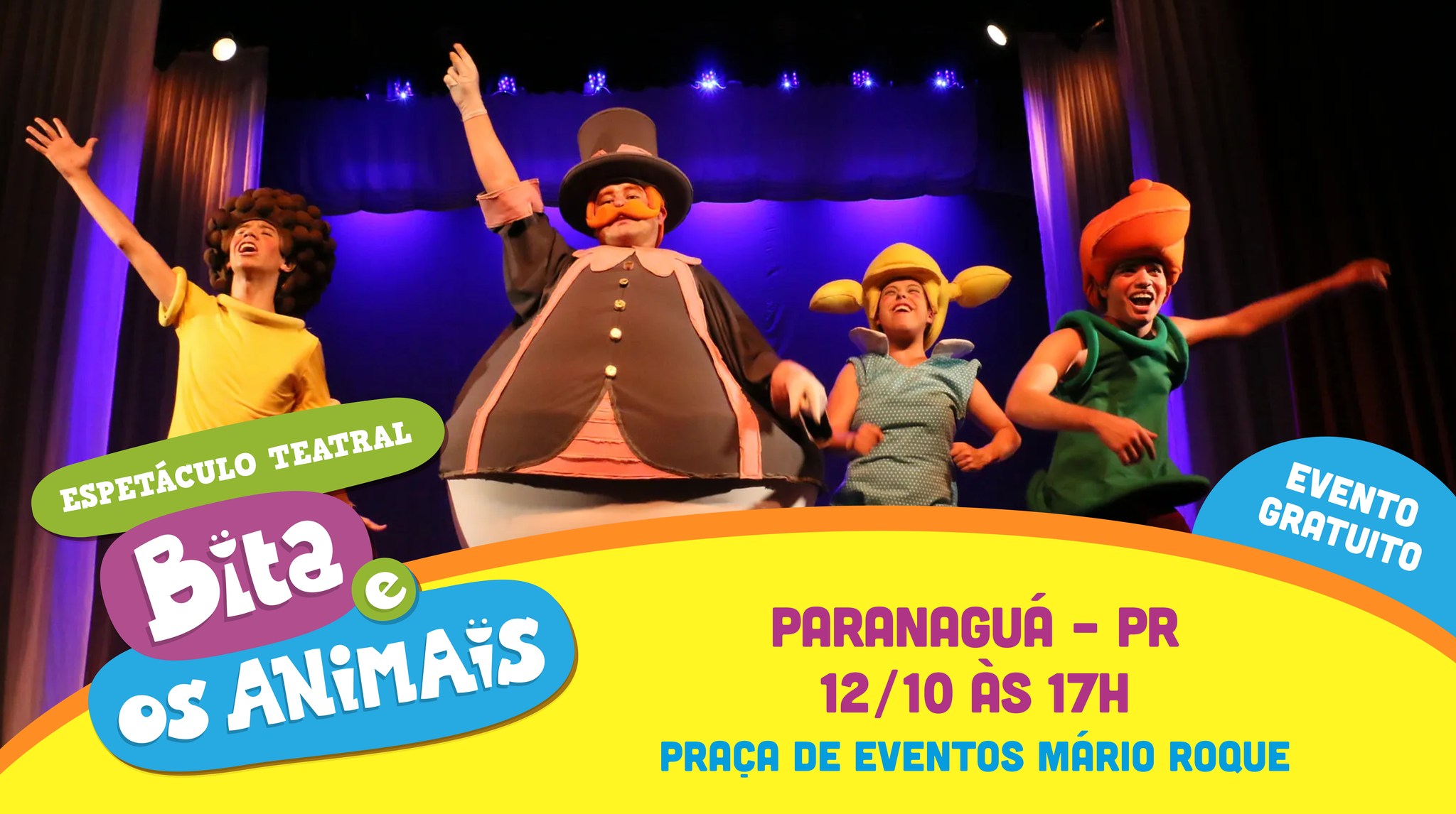 Em homenagem ao Dia das Crianças, Paranaguá receberá no dia 12 de outubro (domingo) uma apresentação especial para o público infantil. O espetáculo teatral Bita e os Animais será exibido com entrada gratuita às 17h, na Praça de Eventos Mário Roque, localizada na Rua General Carneiro, 2-86, no Centro Histórico da cidade.