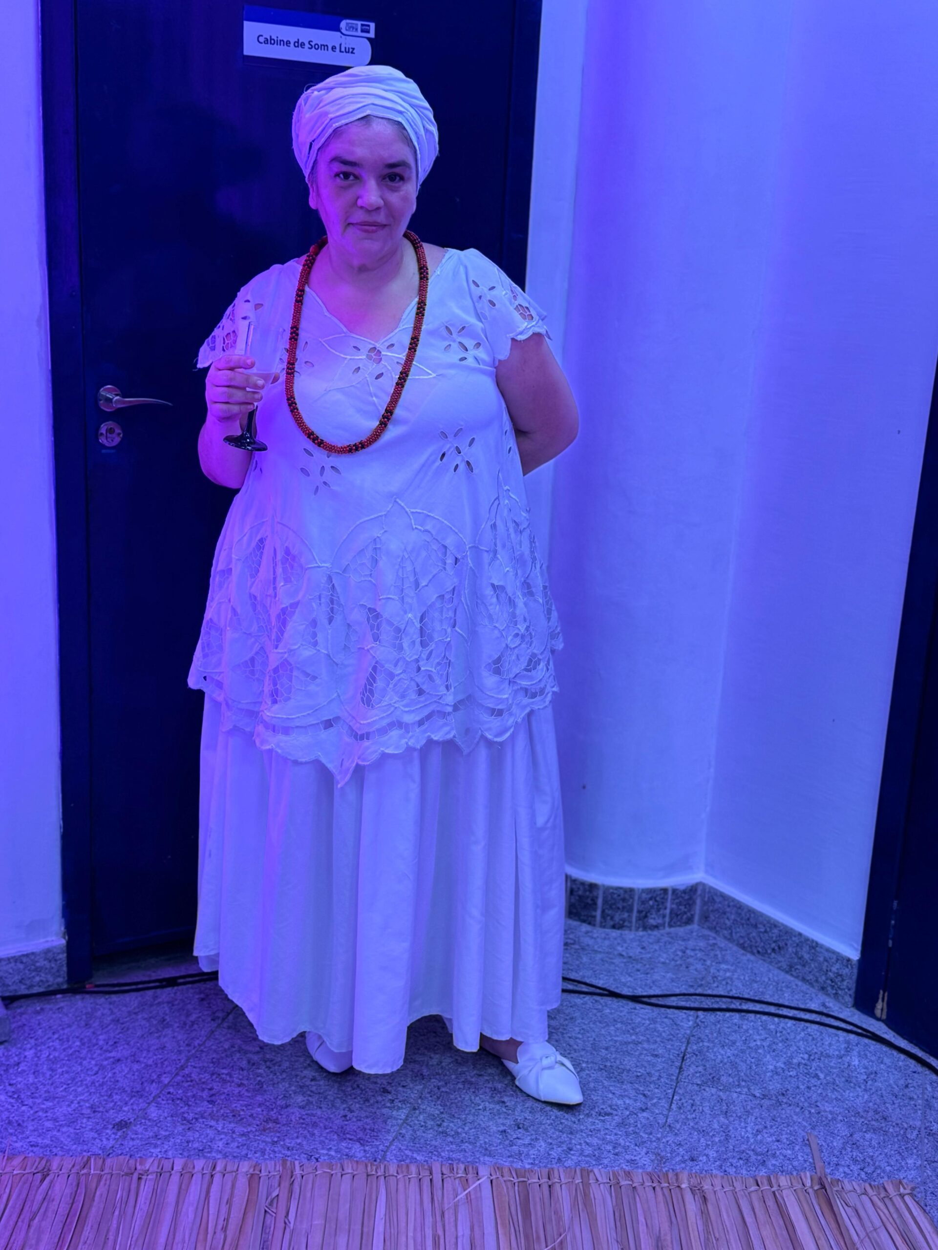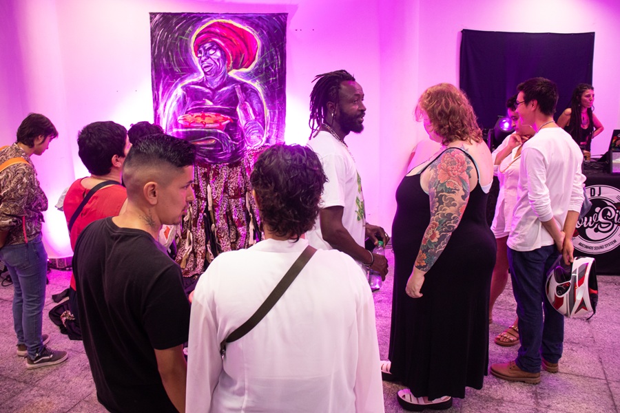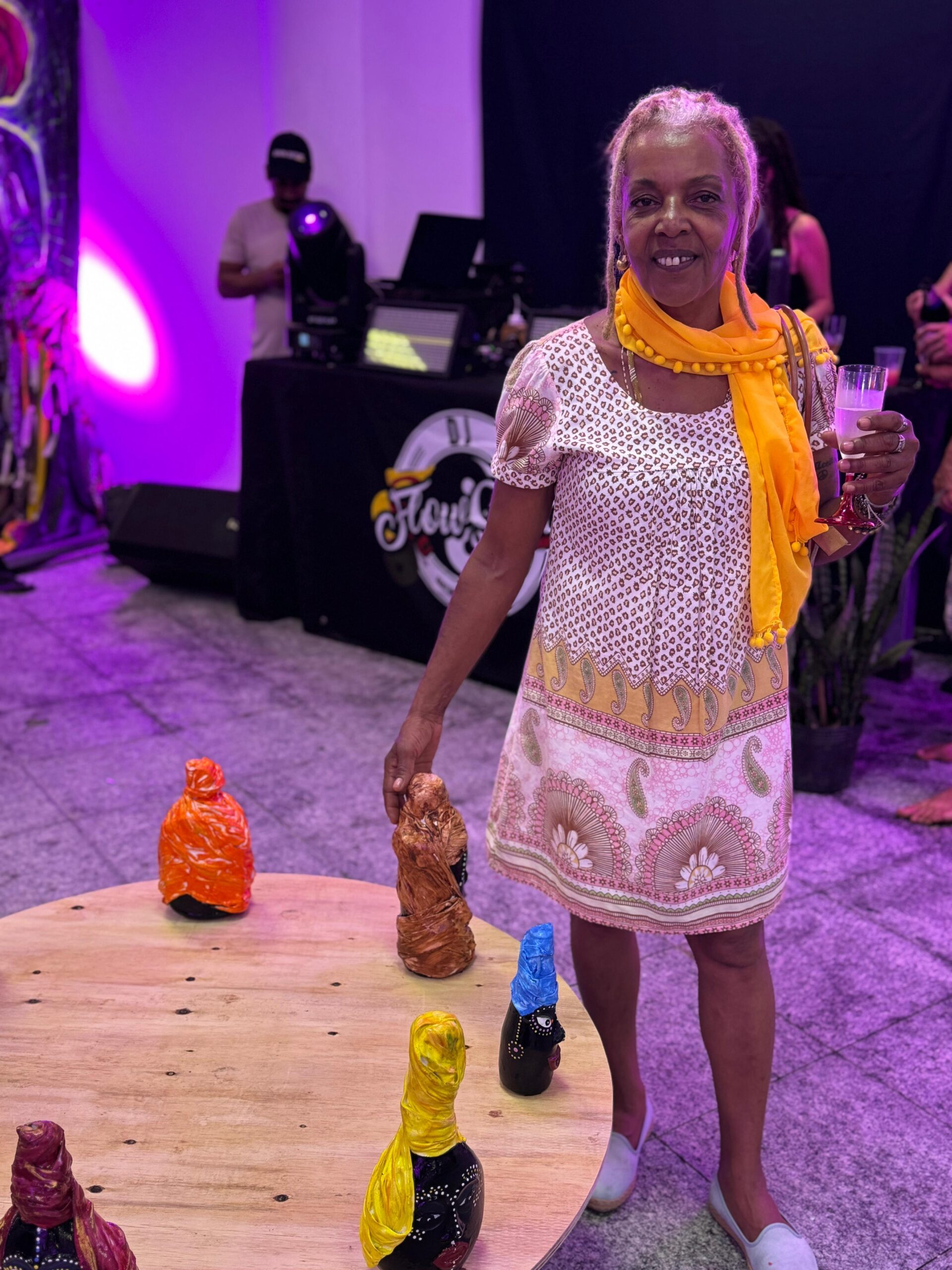 Mila Gouveia, ialorixá e artista plástica, apresenta uma escultura de Exu Bará, numa representação que confronta o racismo religioso e valoriza a espiritualidade afro-brasileira. “Hoje, em vez de descarregar os outros, eu me descarrego como artista. Exu é transformação — e agora ele protege a mostra”, declara.