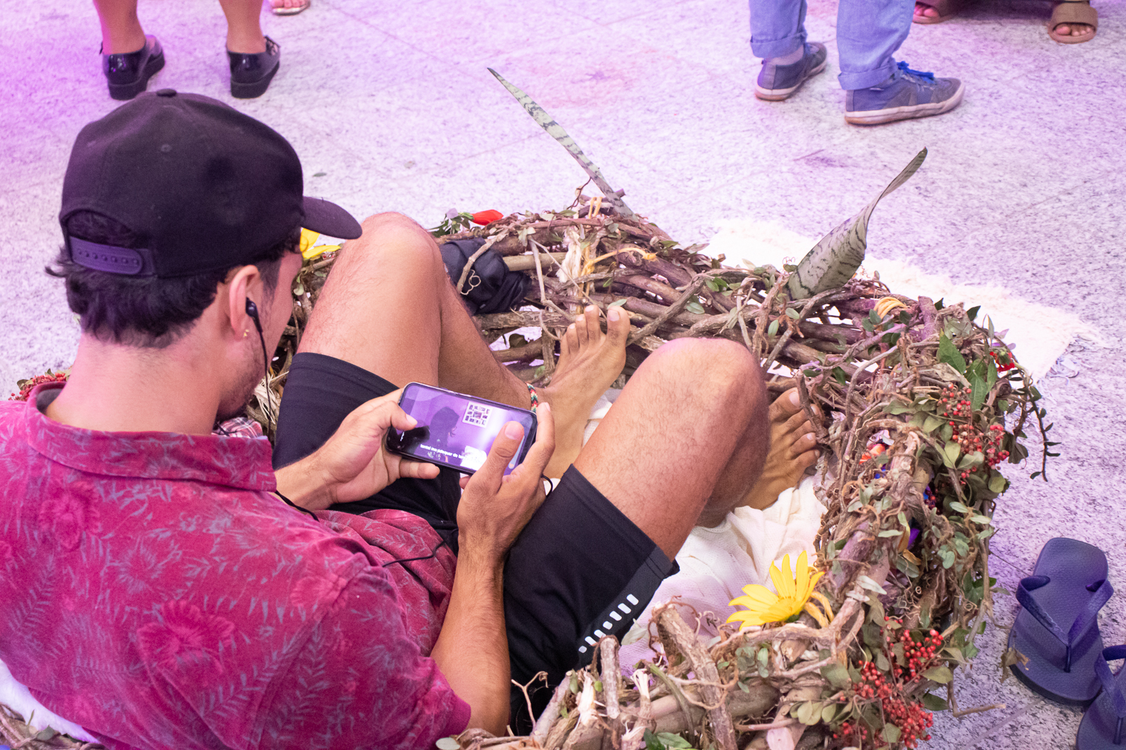 A jornalista, professora e escritora Aline Olívia criou a instalação Ninho – O Peso do Voo, com ninhos humanos que acolhem o público. “O descarrego é deixar o que não serve e construir um espaço onde a gente possa pousar, se acolher. É sobre autoamor”.