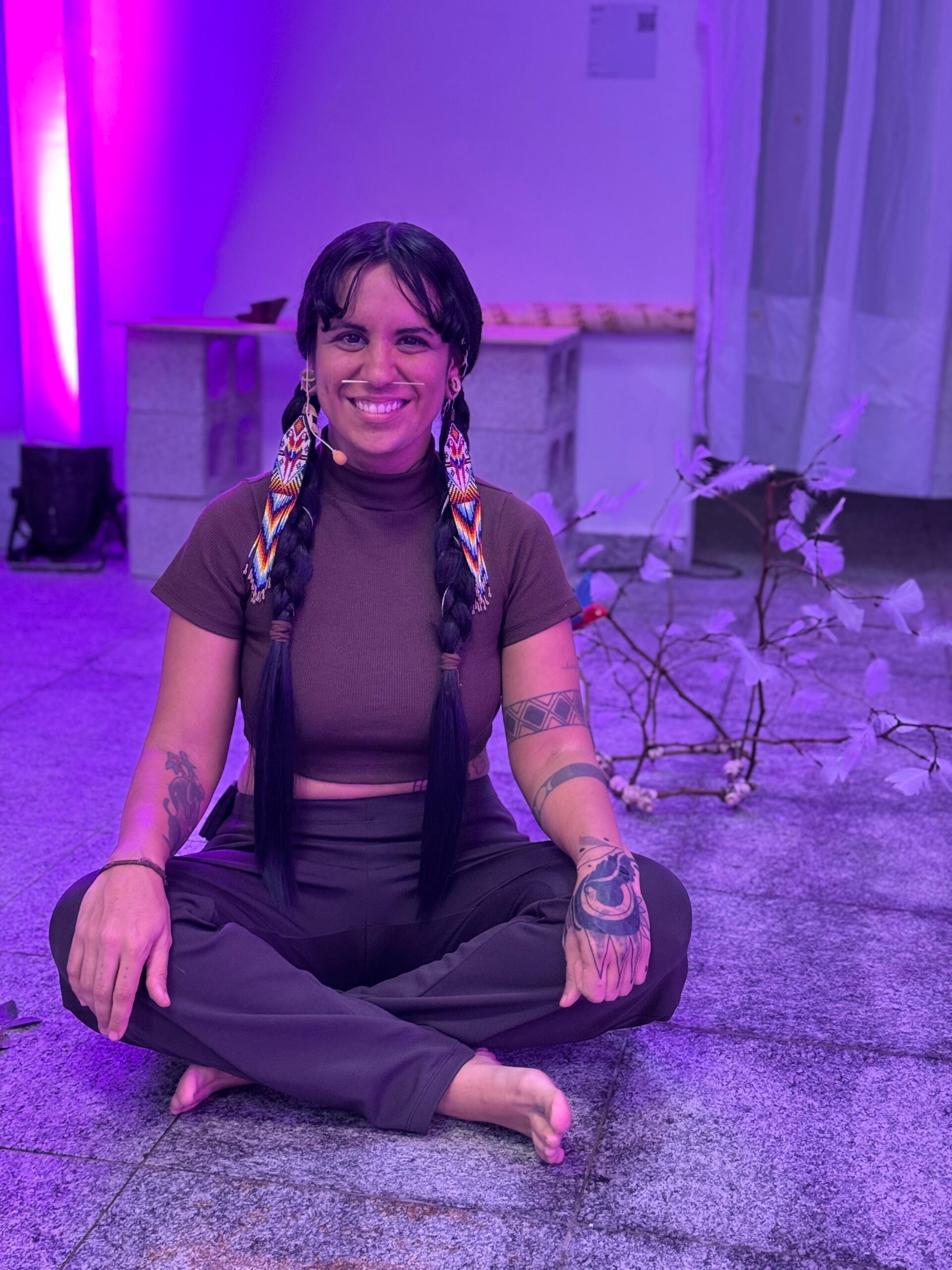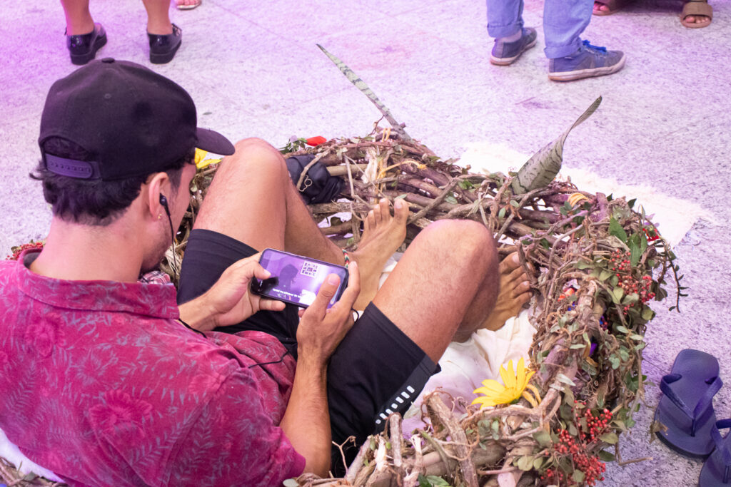 A performance de Kairu Ypiara, artista indígena da aldeia Cerco Grande, em Guaraqueçaba, trouxe ao público os atravessamentos da vida indígena contemporânea. “Como dizia Jaider Esbell, uma grande referência indígena para mim, que partiu tragicamente muito cedo, ‘nossa arte é feitiço: atrai o olhar curioso para que a gente possa falar de temas sérios’. É bom ver a arte indígena ocupando todos os espaços”.