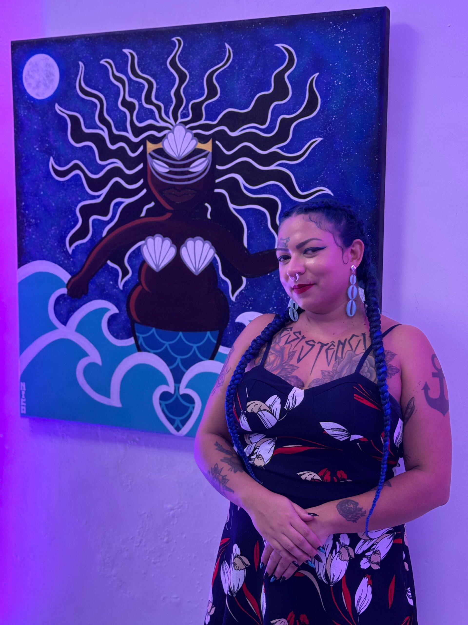 Nico Santos, em sua primeira exposição, apresenta a pintura Rainha dos Oris, uma homenagem à Iemanjá. “A mostra me deu a oportunidade de me enxergar como artista. É uma honra louvar minha mãe espiritual por meio da arte”.