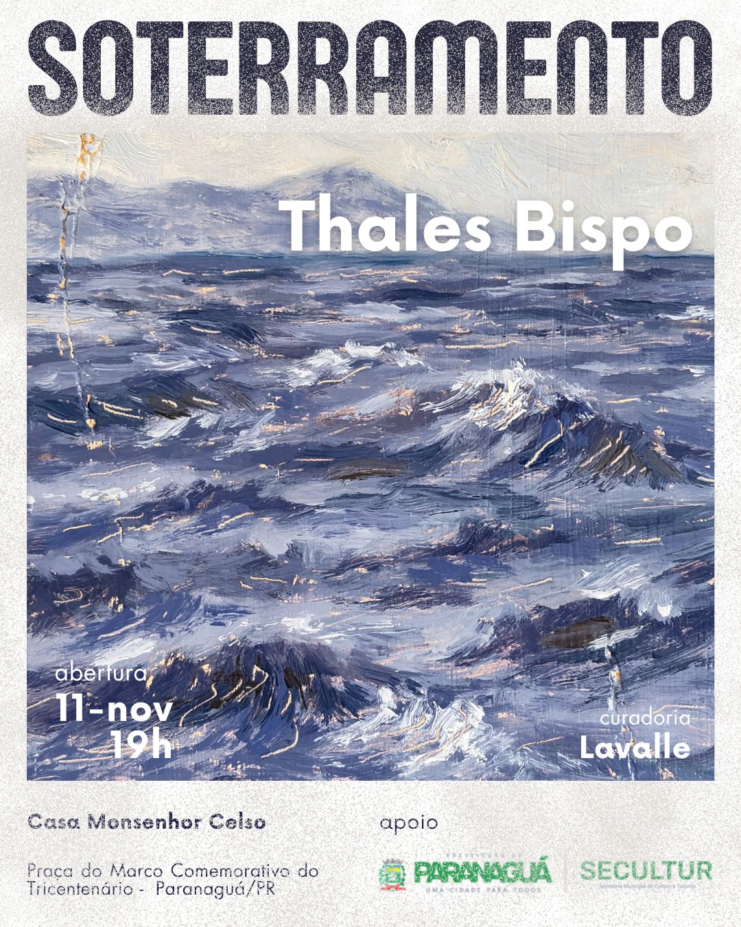 A Casa Monsenhor Celso, no Centro Histórico de Paranaguá, recebe a partir das 19h desta terça-feira, 11 de novembro, a abertura da exposição “Soterramento”, do artista Thales Bispo, natural de Matinhos. A mostra apresenta 35 obras distribuídas em quatro salas e propõe um mergulho nas paisagens, identidades e memórias do território caiçara do Litoral.