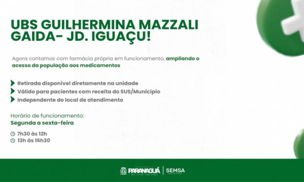 A partir desta semana, a Unidade Básica de Saúde (UBS) Guilhermina Mazzali Gaida, localizada no Jardim Iguaçu, passa a contar com farmácia própria em funcionamento. A iniciativa tem como objetivo ampliar o acesso da população aos medicamentos e garantir mais comodidade aos pacientes.