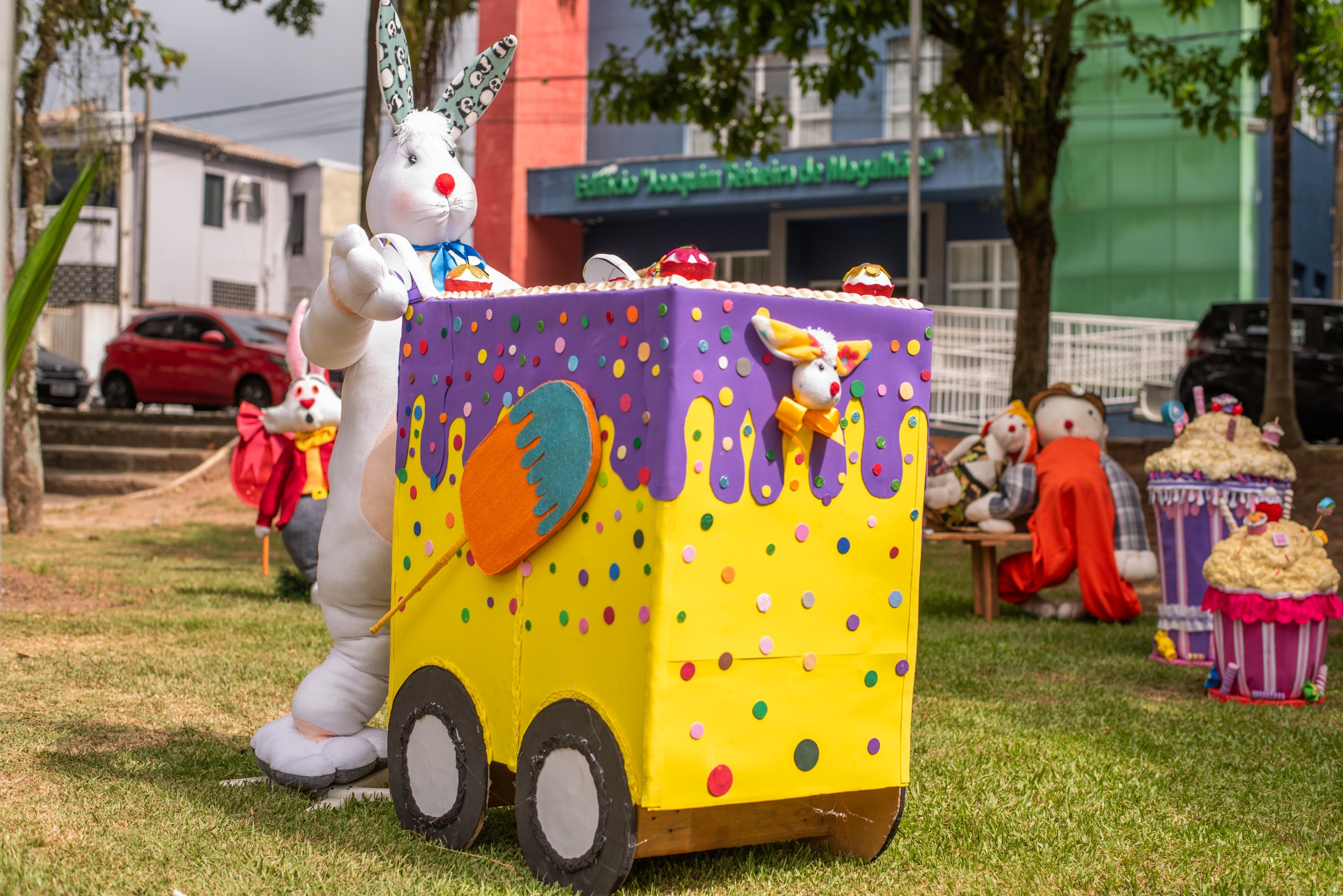Outro destaque é a decoração especial de Páscoa, produzida pela equipe do Provopar com materiais recicláveis. Bonecos confeccionados com galões reaproveitados, fibras recicladas e tecidos reutilizados compõem o cenário temático, pensado especialmente para fotos e interação do público.