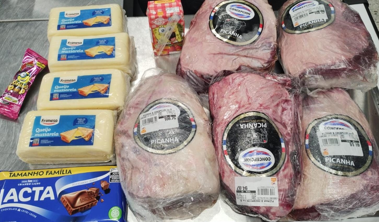 Com o abordado foram encontradas cinco peças de picanha, quatro embalagens de aproximadamente um quilo cada de queijo, uma barra de chocolate, um pirulito e um iogurte, totalizando quase R$ 700.