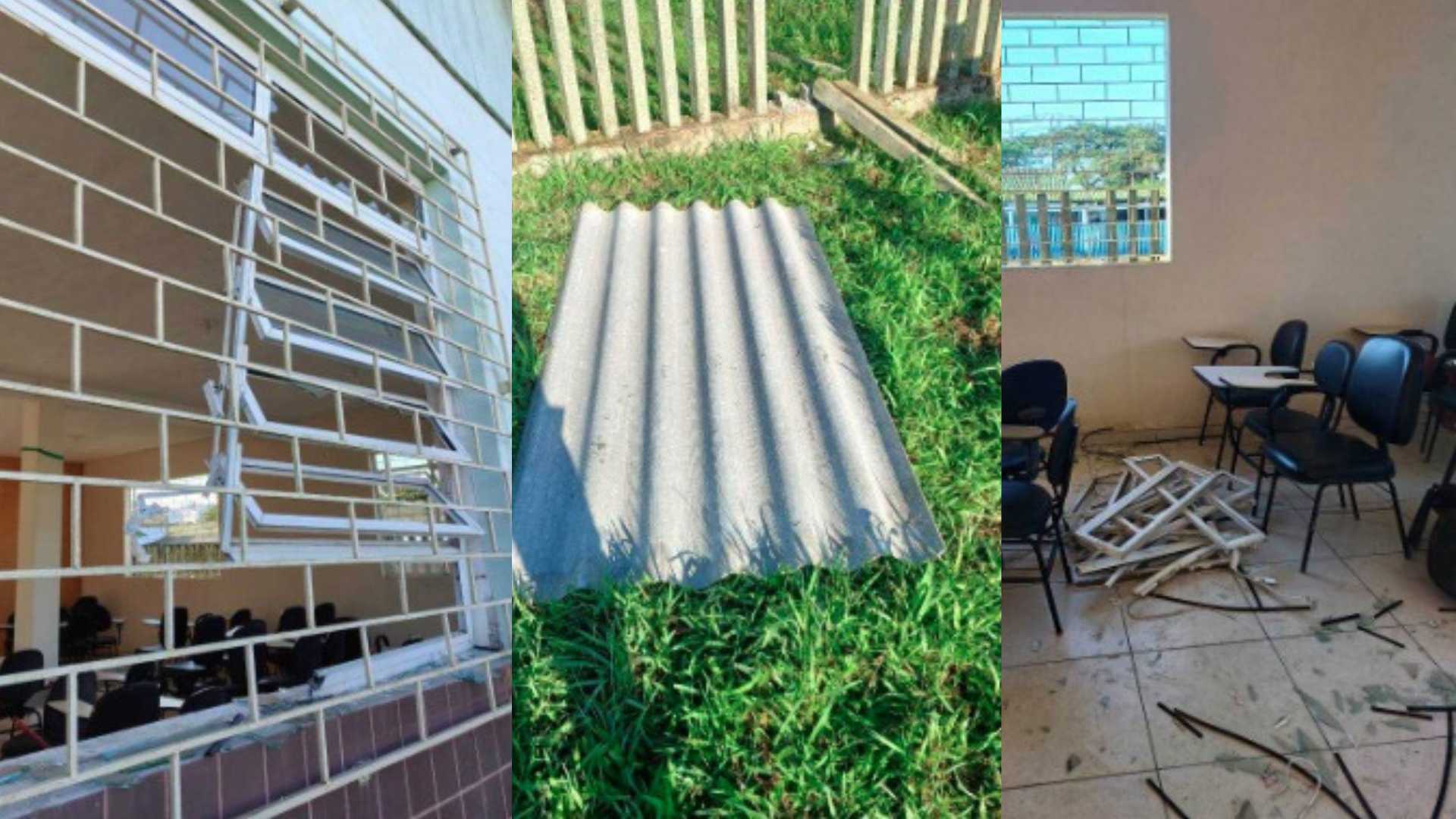 Além da janela que estava sendo furtada, o indivíduo já havia retirado outra e deixado uma telha de 8mm, nova, jogada do lado de fora da escola.