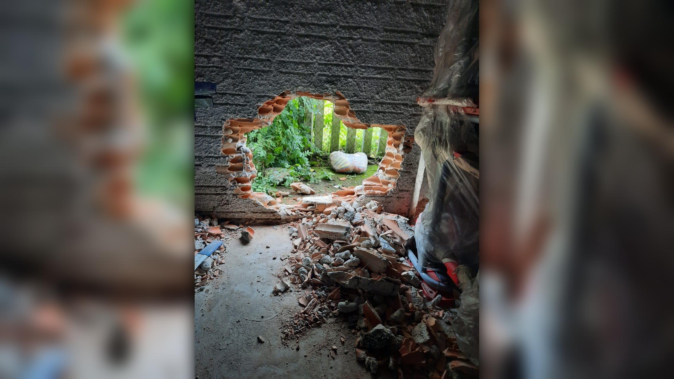Para invadir o almoxarifado, o suspeito fez um buraco na parede do prédio. Ele também danificou cadeados de um portão.