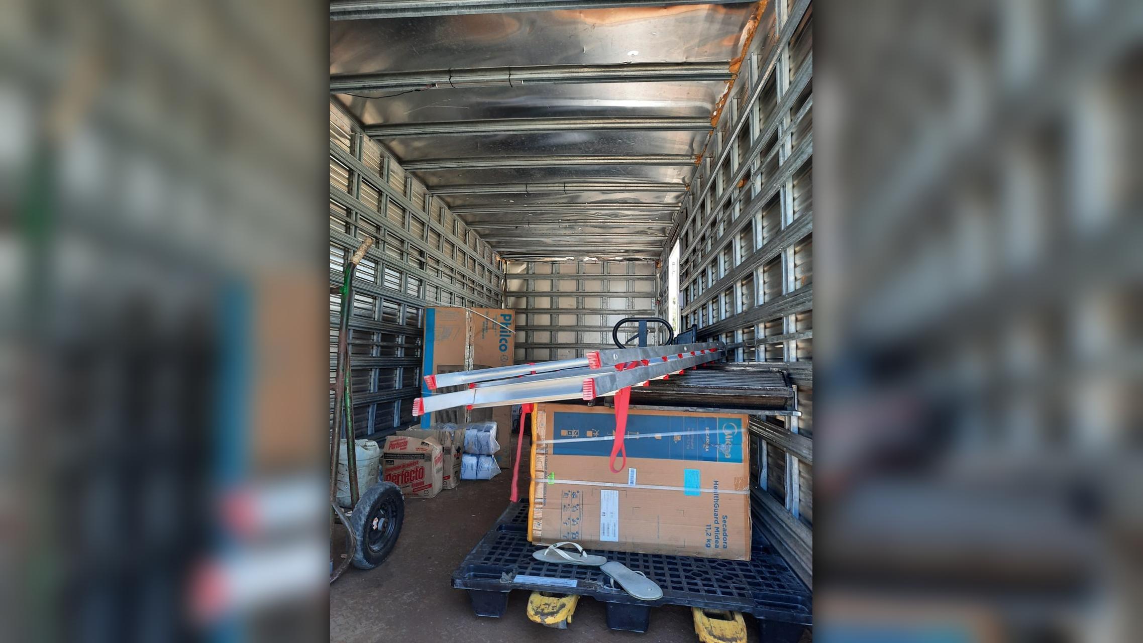 Imediatamente, as equipes foram para o endereço indicado e encontraram dentro do imóvel cerca de 40 pilhas AA, aproximadamente 16 quilos de sabão em pó, 10 lâmpadas, 10 galões de removedor, quatro latas de tinta spray, três pacotes de sabão em pedra, dois refletores, dois fardos de papel toalha, uma secadora, um micro-ondas, uma televisão nova na caixa, um disjuntor, um jogo de chaves tipo catraca, um soprador profissional, um simulacro de arma de fogo e duas munições.