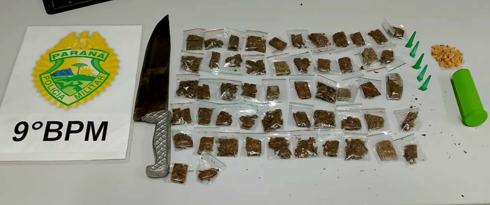 Com ele, os policiais encontraram a peixeira, indicada na denúncia, uma bolsa tiracolo com 53 buchas de maconha, 5 pinos plásticos com cocaína e um pote com pedras de crack.