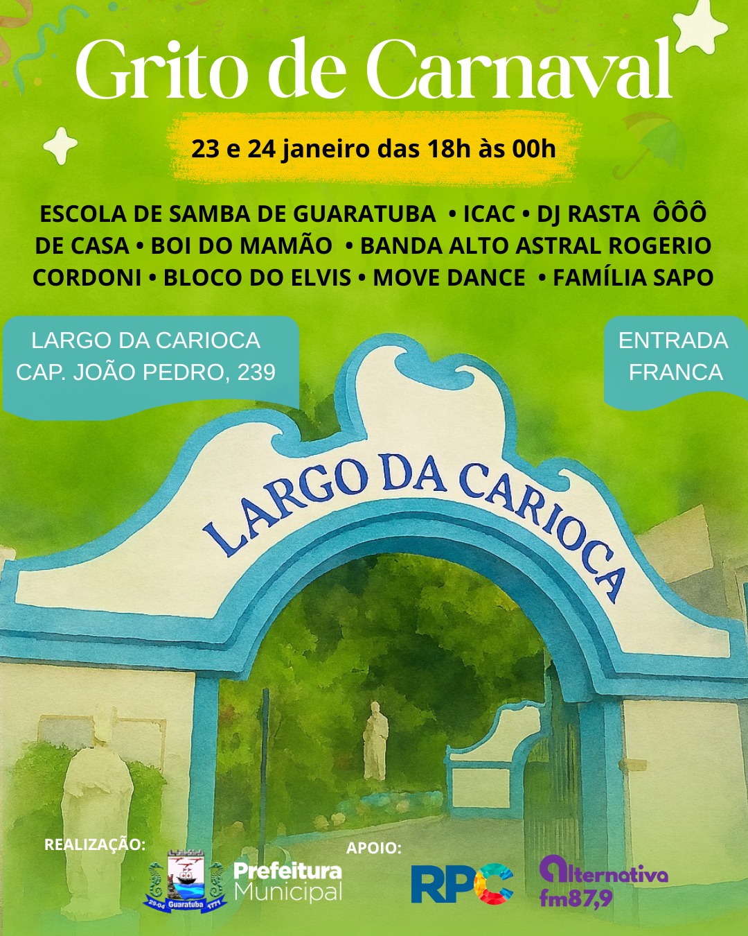 O clima carnavalesco já está tomando conta das cidades do litoral do Paraná. Nesta sexta-feira, 23, e sábado, 24, a Prefeitura de Guaratuba promoverá o “Grito de Carnaval”. A programação tem início por volta das 18h e segue até a meia-noite. Já o esquenta da festa começa às 17h, na Praça dos Namorados, e segue até o Largo da Carioca.
