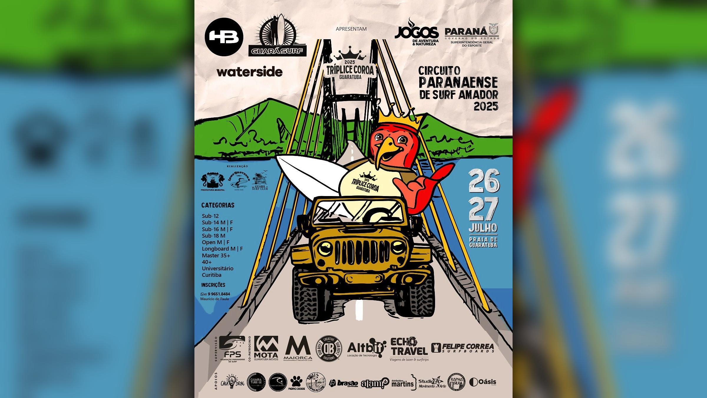 A cidade de Guaratuba será palco da 1ª Etapa da Tríplice Coroa de Surf, neste sábado e domingo, 26 e 27 de julho, com a realização da 4ª Etapa do Circuito Paranaense de Surf Amador 2025. A competição acontece na Praia Central e reúne atletas de diversas categorias, com destaque para as disputas de base e amadoras.