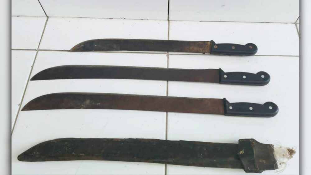 Com as informações repassadas, a equipe foi até a casa do suspeito e conseguiu abordá-lo. O homem estava com três facões na bainha, presa no cinto. Outro facão foi encontrado e apreendido no local da abordagem.