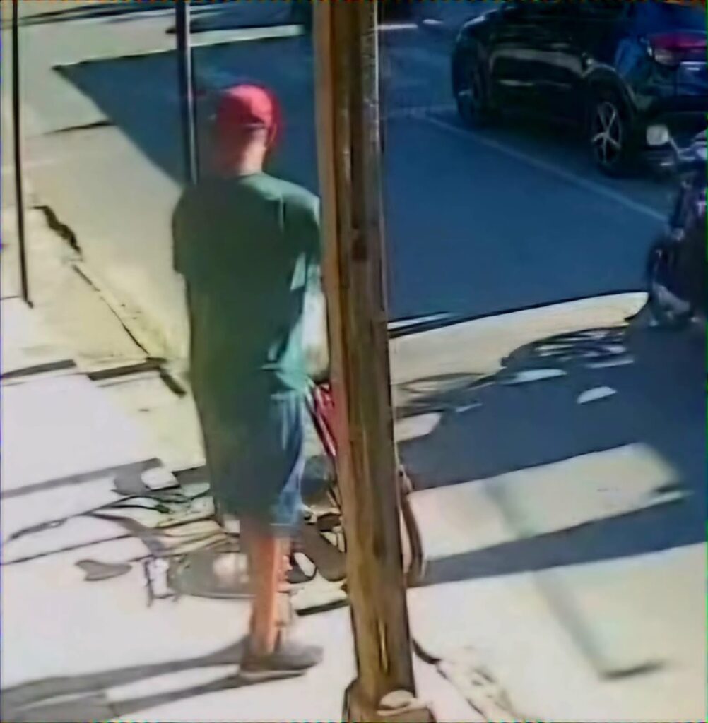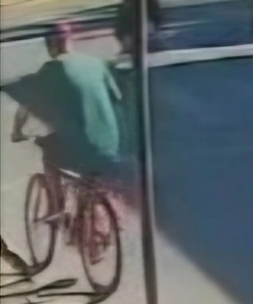 Câmeras de segurança instaladas em estabelecimentos comerciais registraram o momento em que um homem usando boné vermelho, camiseta, cor verde, bermuda azul e calçando tênis subiu na bicicleta e saiu pedalando na direção da ponte.
