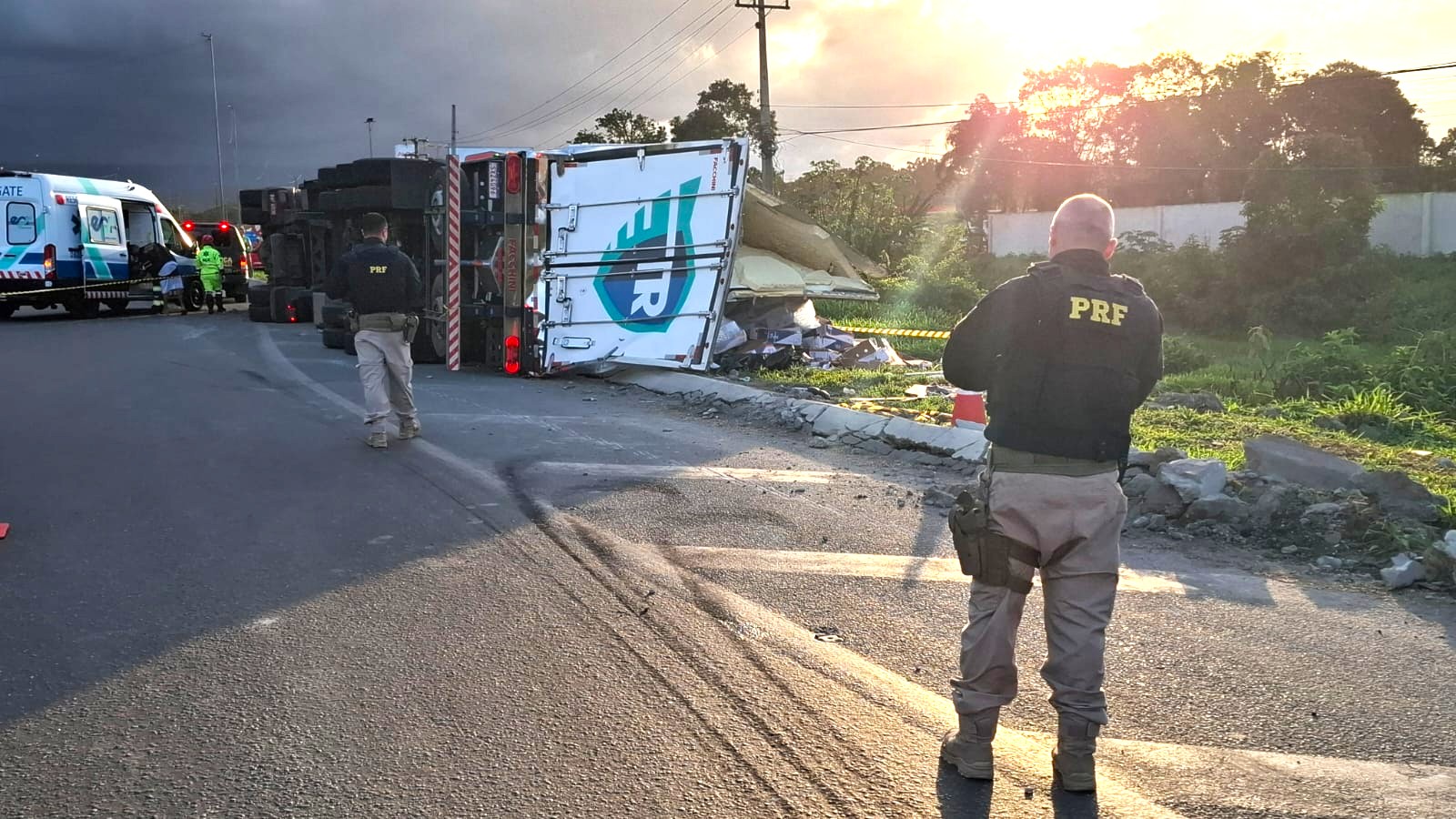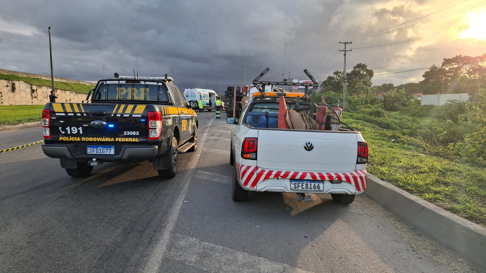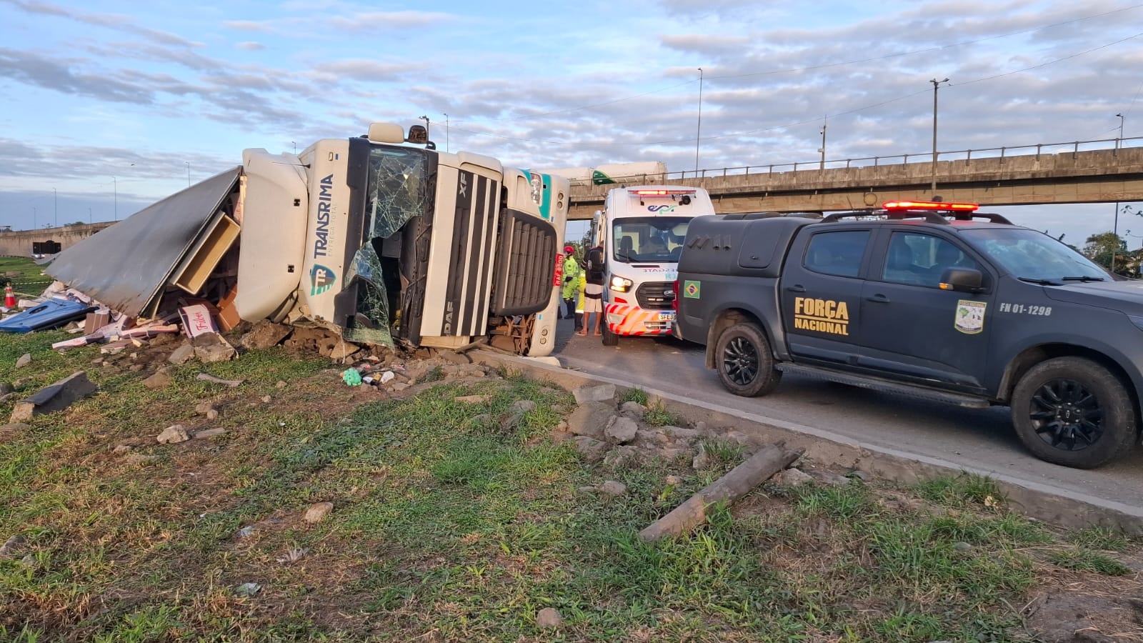 O condutor do veículo de carga perdeu o controle da direção ao acessar a pista da rodovia federal, nas proximidades do viaduto do Jardim Samambaia.