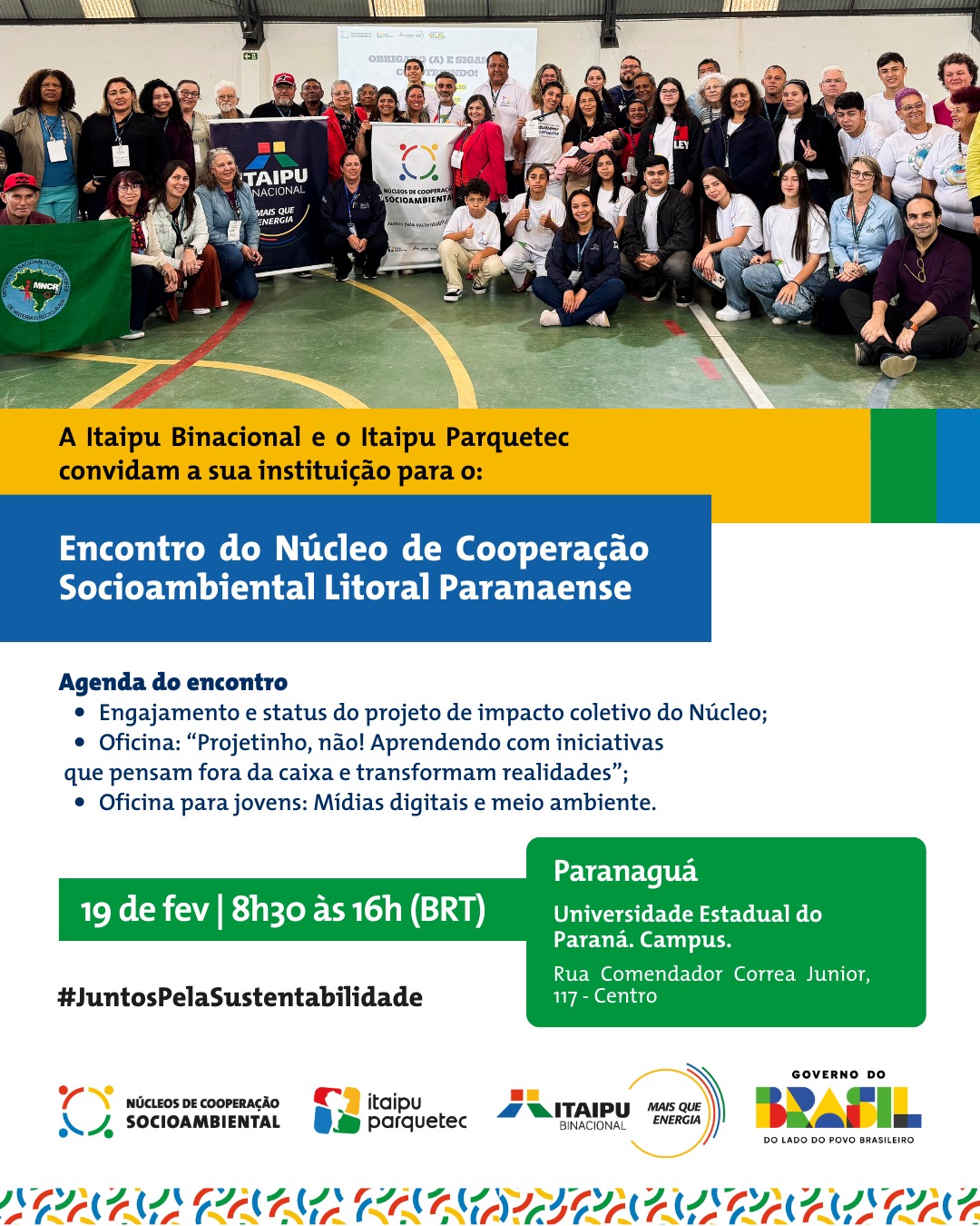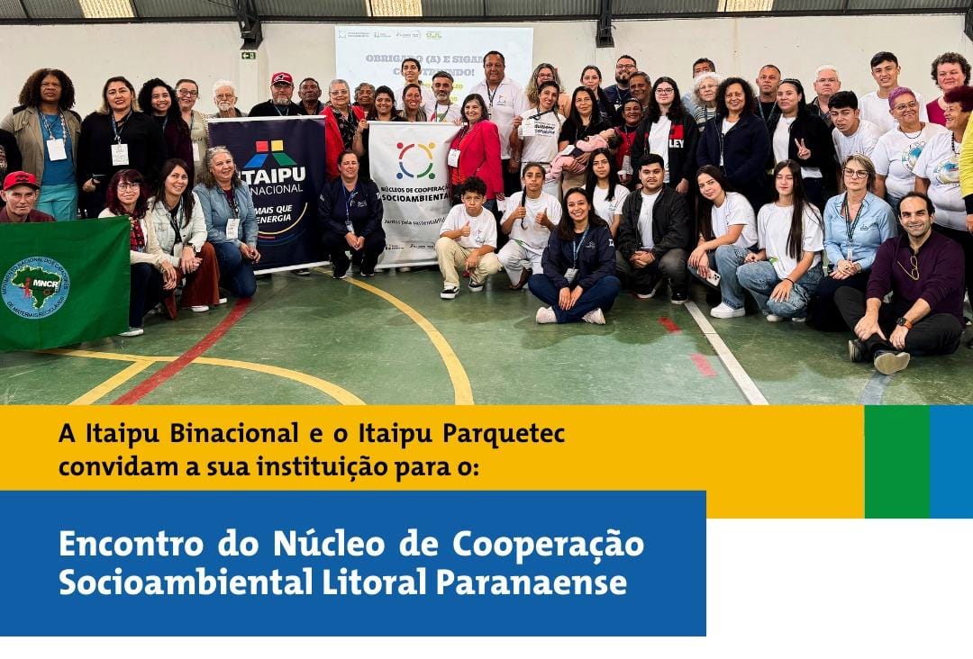 A Itaipu Binacional e o Itaipu Parquetec promovem, no próximo dia 19 de fevereiro de 2026, o Encontro do Núcleo de Cooperação Socioambiental – Litoral Paranaense, em Paranaguá. A iniciativa convida instituições da região a participarem de um dia de diálogo, troca de experiências e fortalecimento das ações voltadas à sustentabilidade.