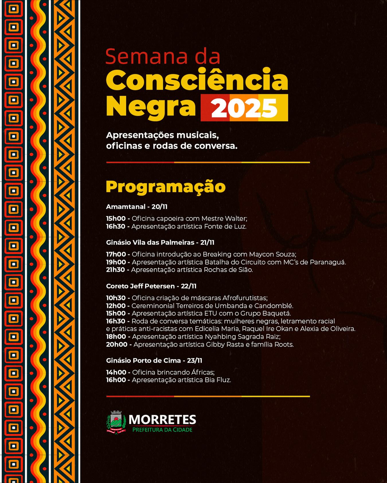 A Prefeitura de Morretes, por meio da Secretaria Municipal de Turismo e Cultura, realizará entre os dias 20 e 23 de novembro a programação especial da Semana da Consciência Negra 2025, com atividades gratuitas distribuídas em diferentes pontos da cidade. O evento reunirá apresentações musicais, oficinas, rodas de conversa e manifestações culturais que destacam a história, a identidade e as contribuições da população negra para o município e para o país.