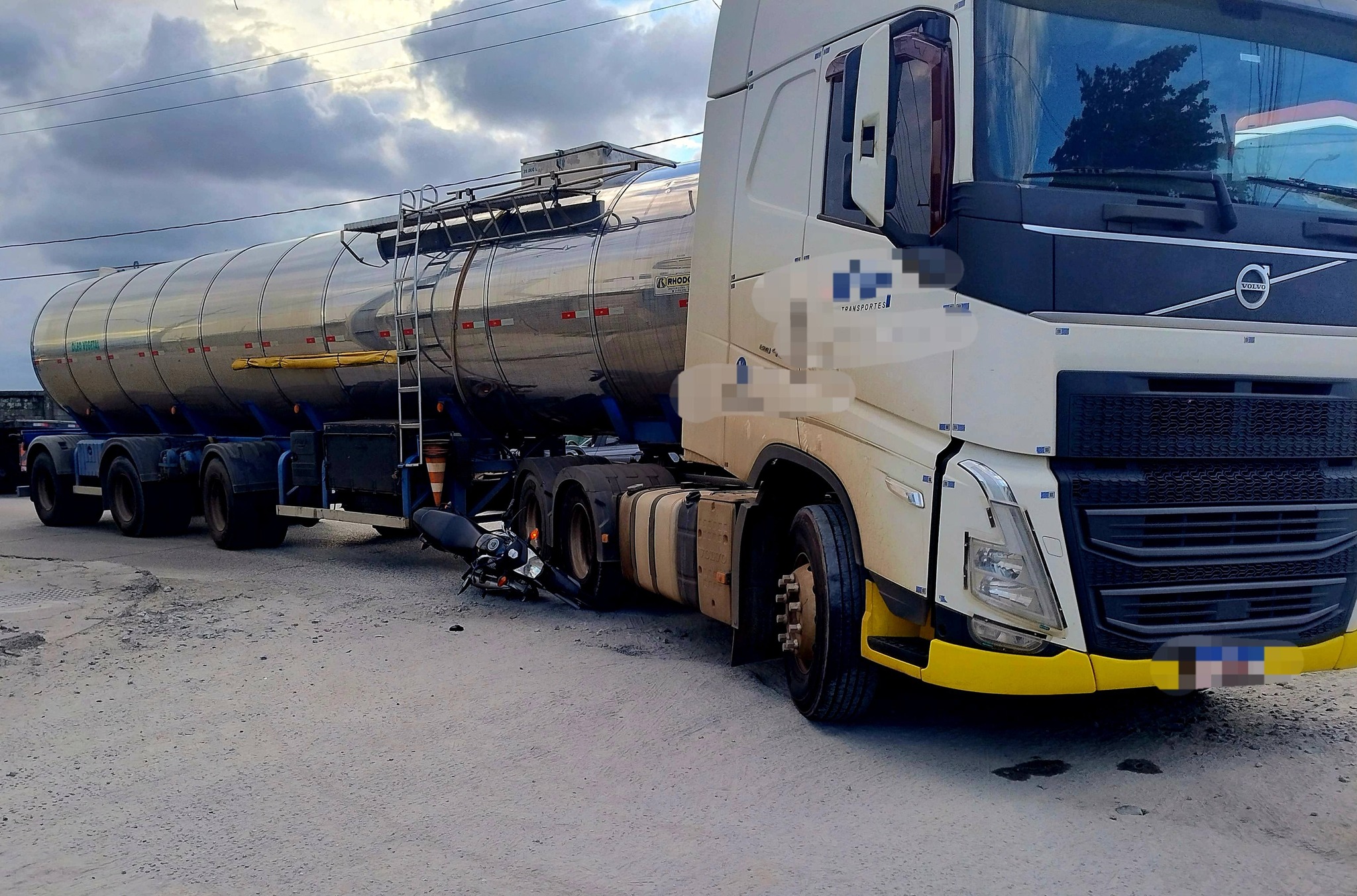 Uma motocicleta Honda CG 150, cor preta, ficou presa no rodado traseiro do cavalo mecânico de um caminhão tanque após um acidente registrado na tarde desta segunda-feira, 9, na Avenida Bento Rocha, no bairro Vila Portuária, em Paranaguá.