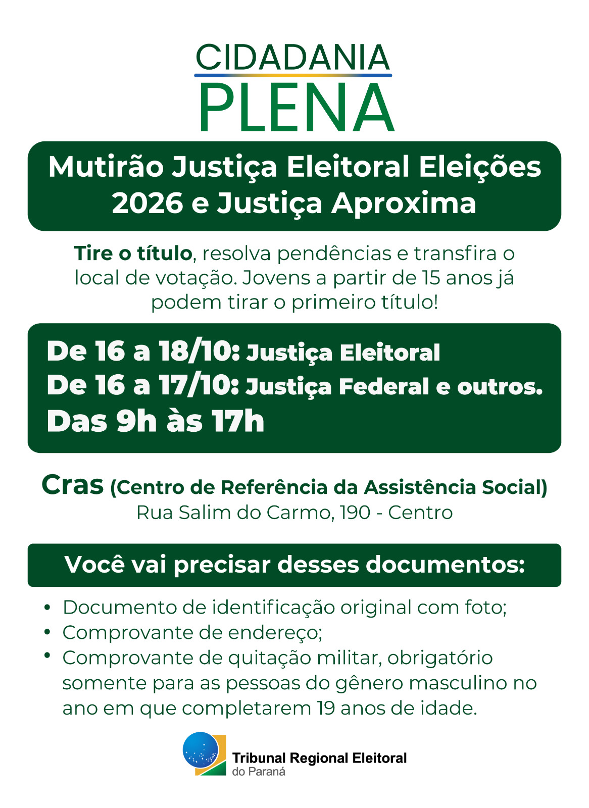 Estima-se que, ao longo dos três dias de mutirão, cerca de 300 pessoas tirem o Título de Eleitor, façam revisões ou quitem seus débitos com a Justiça Eleitoral. Atenção: quem completou 15 anos já pode tirar o Título – os jovens podem votar caso completem 16 anos até a data do primeiro turno.
