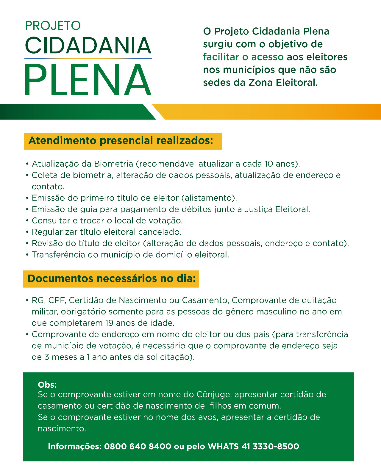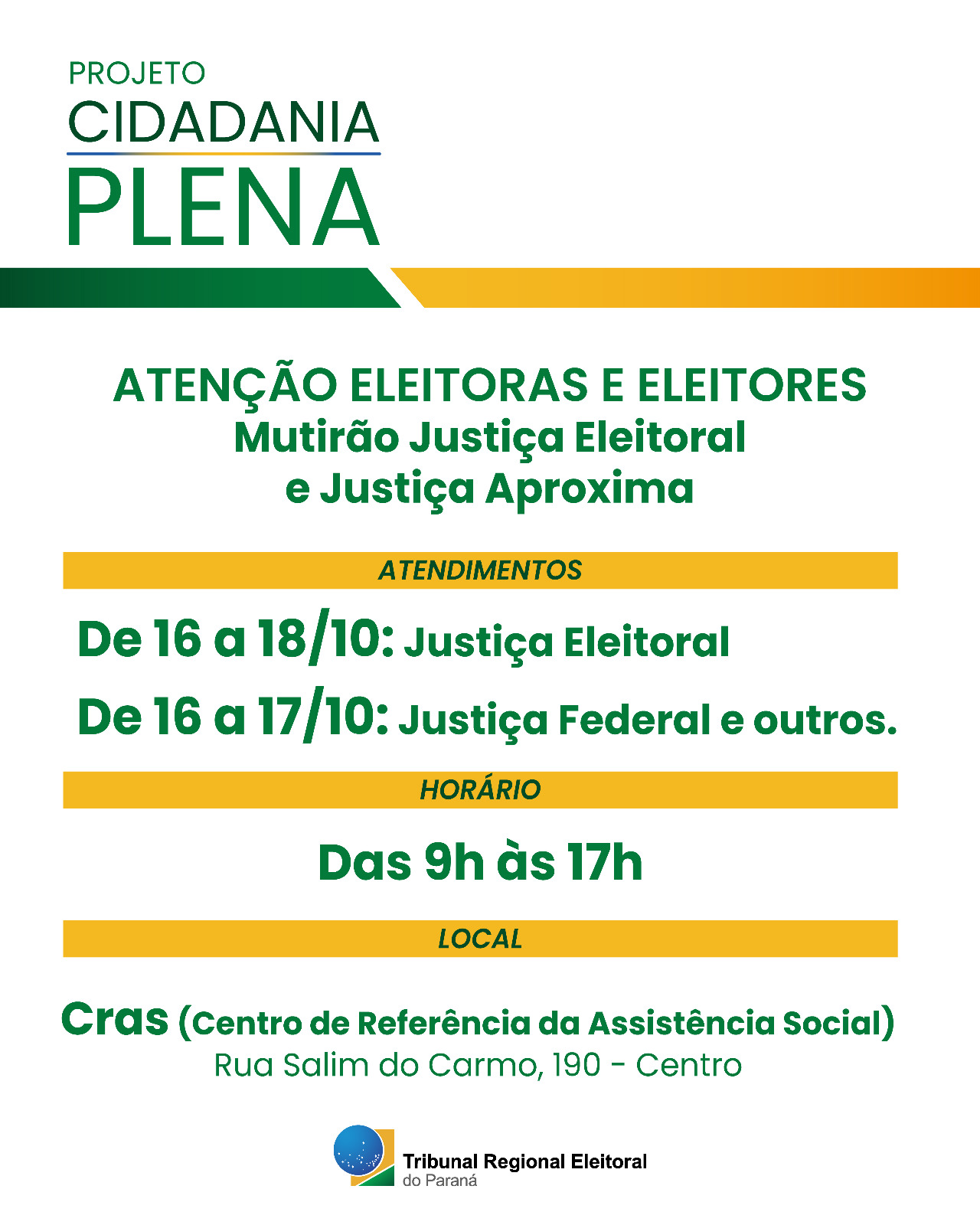 Nesta quinta (16), sexta-feira (17) e neste sábado (18), o programa Cidadania Plena – todo voto importa, de iniciativa do Tribunal Regional Eleitoral do Paraná (TRE-PR), atenderá as eleitoras e os eleitores do município de Guaraqueçaba e das ilhas do litoral do Paraná. As cidadãs e os cidadãos serão recebidos no CRAS (Centro de Referência da Assistência Social), das 9h às 17h. Na sexta-feira (17) e no sábado (18), o mutirão da Justiça Eleitoral contará com a participação do presidente do TRE-PR, desembargador Sigurd Roberto Bengtsson.