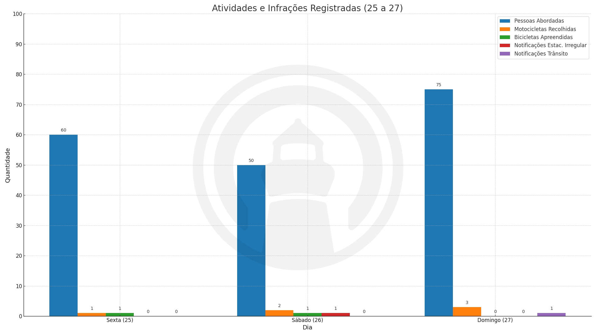Os agentes realizaram abordagens em frequentadores de logradouros públicos e em veículos que trafegavam pelas ruas e avenidas da cidade. Ao todo foram abordadas 185 pessoas e seis veículos foram recolhidos, entre eles, carros, motocicletas e bicicletas motorizadas. As guarnições, de diversos departamentos, estiveram na região da rodoviária, nas praças dos bairros Nilson Neves, Jardim Samambaia, Porto Seguro, Jardim Esperança, em toda a extensão da Rua Pecêgo Júnior, em vários pontos do Centro Histórico, na Praça do Japão, na Praça do Guincho e no Mercado Municipal.